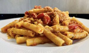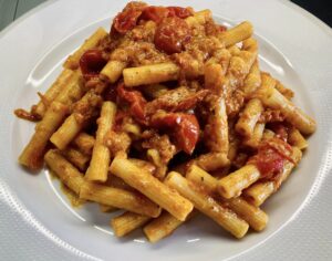 La prima cosa da fare per cucinare i cavatelli con il sugo vedovo è preparare la pasta. Se non avete tempo potete usare anche un formato di pasta già pronto come i sedani che abbiamo usato in foto anche se la ricetta originale prevede l’utilizzo di pasta fresca e in particolare dei cavatelli. Quindi per prepararli impastate la semola insieme a 250 ml di acqua e un pizzico di sale. Quando avrete ottenuto un panetto compatto e omogeneo, ricopritelo con la pellicola trasparente e lasciatelo riposare per mezz’ora. Una volta trascorso il tempo necessario, infarinate il piano di lavoro.
