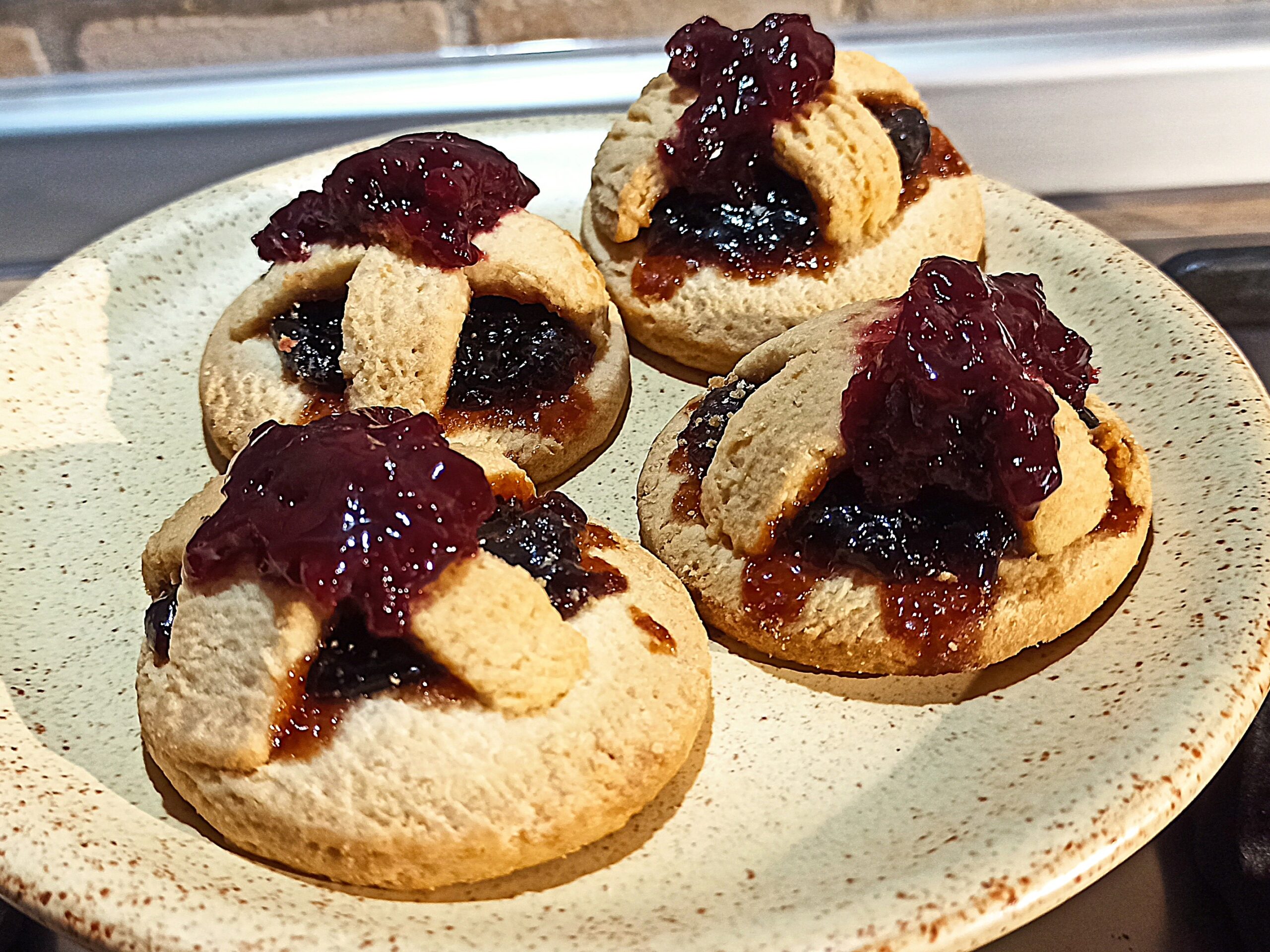 In alternativa, potete utilizzare un mixer ol’ impastatrice. Trascorso il tempo di riposo della pasta frolla, infarinate il piano da lavoro, infarinate anche il mattarello, ed iniziate a stendere piano, piano la sfoglia, assicurandovi che non attacchi al piano da lavoro. Dovete ottenere uno spessore di circa cinque millimetri. Ricavate dei dischetti, e per ogni dischetto due striscioline, che incrocerete sul dischetto, in modo da bloccare la marmellata. Farcite con un cucchiaino di marmellata ogni dischetto, poi sovrapponete le striscioline ad incrocio. Cuocete in forno preriscaldato a 180° per dieci minuti, ovviamente la cottura varia sempre in funzione del forno. sfornate, fate raffreddare, e prima di servire potete aggiungere ancora un poco di marmellata, e una spolverata di zucchero a velo.