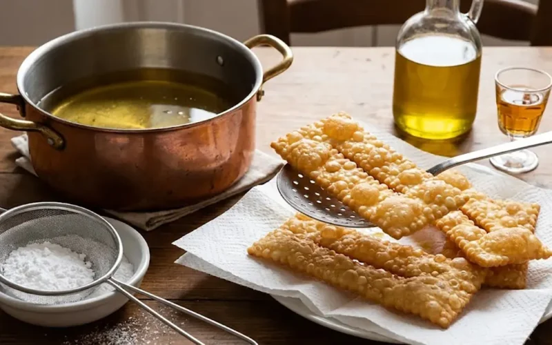 - La Frittura: Scaldate abbondante olio (arachide preferibilmente) a 176°C – 180°C. Tuffate poche chiacchiere alla volta. Si gonfieranno all’istante. Giratele velocemente: bastano pochi secondi per lato. Se l’olio è troppo caldo bruciano, se troppo freddo si inzuppano.