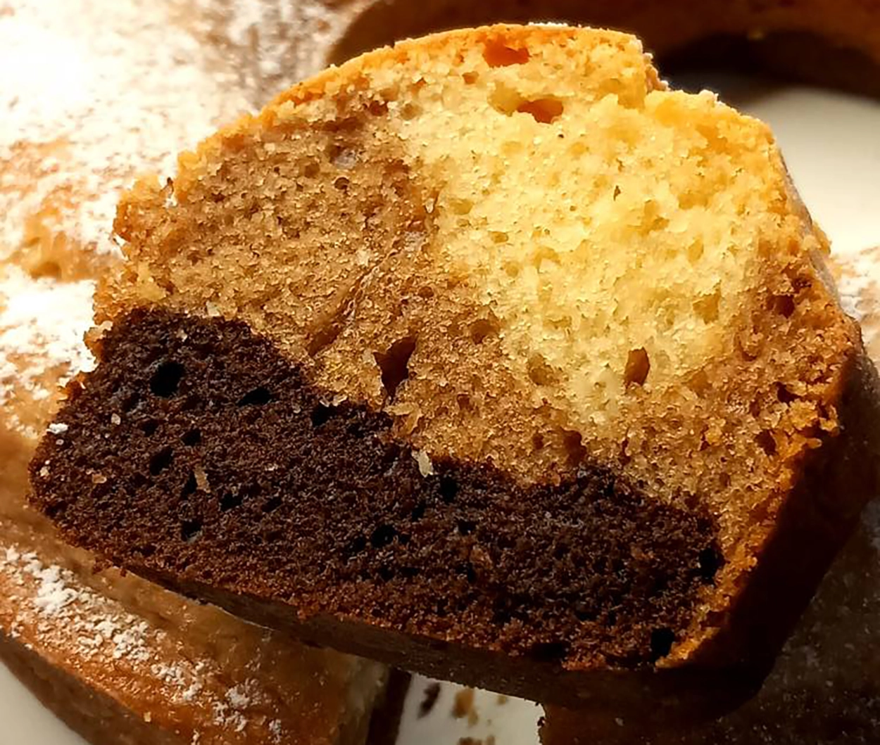 Versiamo per primo l’impasto al cacao, poi quello al caffè e infine quello bianco. Questo creerà un effetto variegato durante la cottura. Preriscaldiamo il forno a 180°C e cuociamo per 35-40 minuti. Il tempo di cottura può variare in base al forno, quindi facciamo la prova stecchino: se esce asciutto, la torta è pronta. Lasciamo raffreddare completamente la torta prima di sformarla. Se vogliamo, possiamo spolverizzarla con zucchero a velo per un tocco finale più elegante