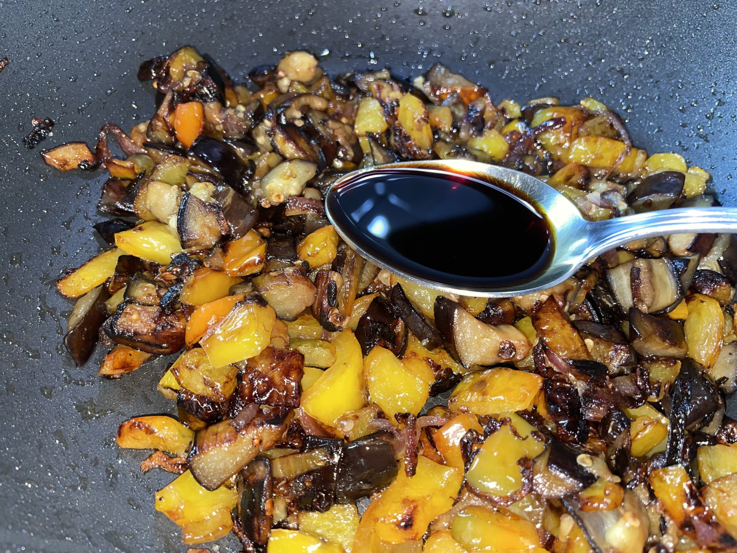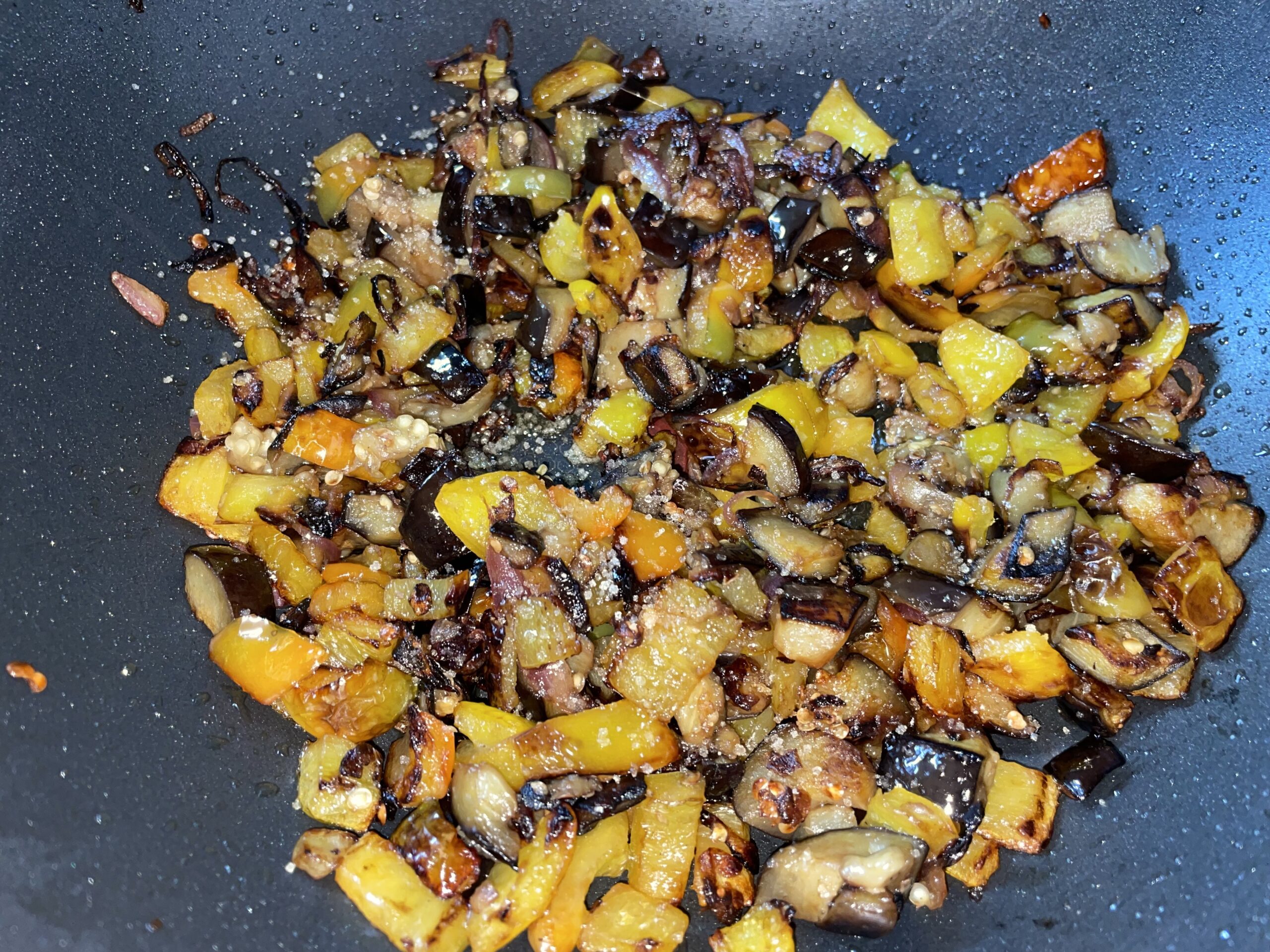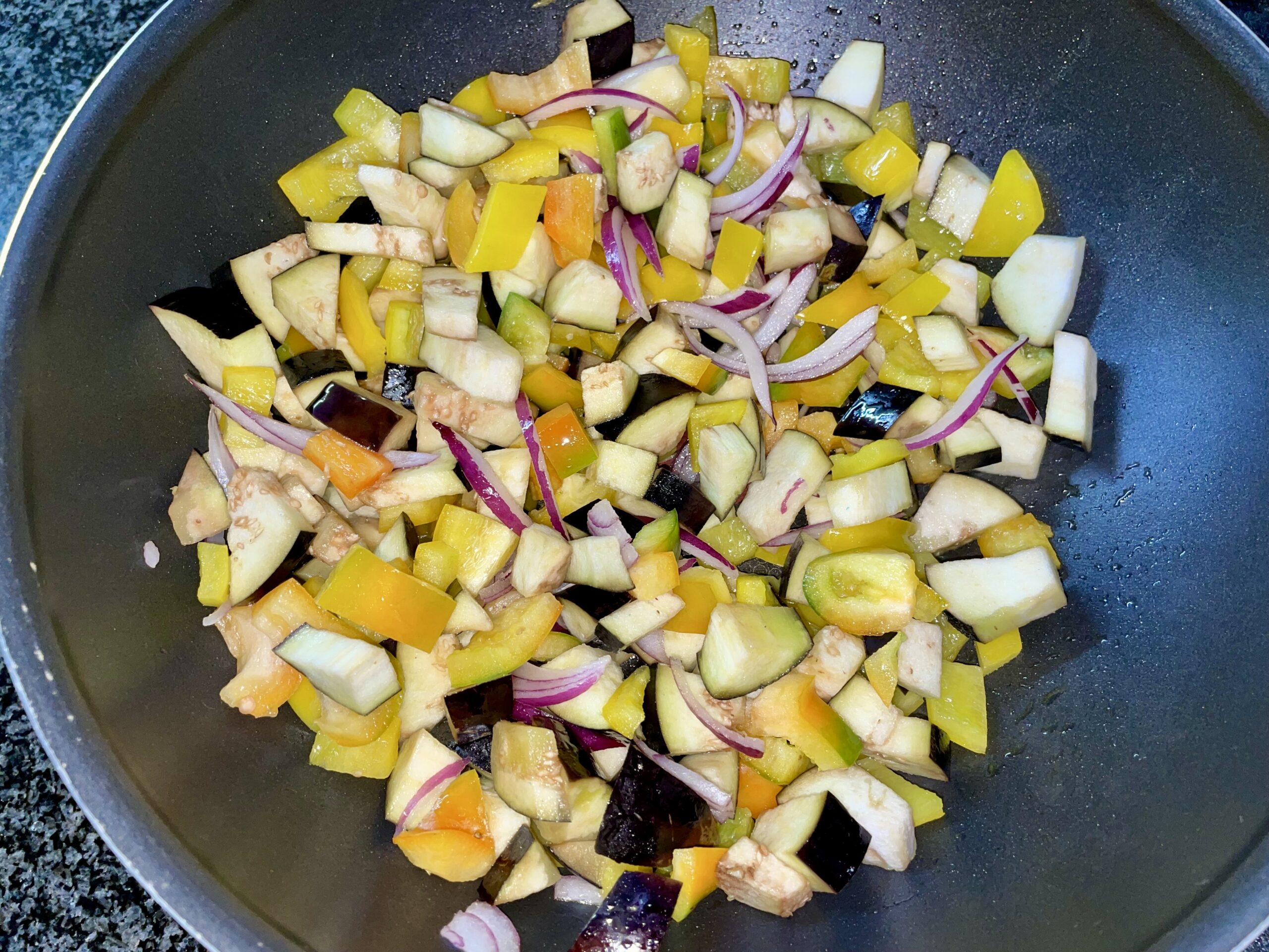 Per preparare la ciambotta all’orientale, iniziate a lavare e tagliare a pezzetti, sia il peperone che le melanzane, tritate finemente la cipolla. Mettete un paio di cucchiai di olio nel wok, portate a temperatura, e aggiungete gli ingredienti.