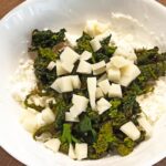 tagliate la scamorza a pezzetti. In una ciotolina, mettete la ricotta, un pizzico di sale e pepe, e unite i friarielli, la scamorza,