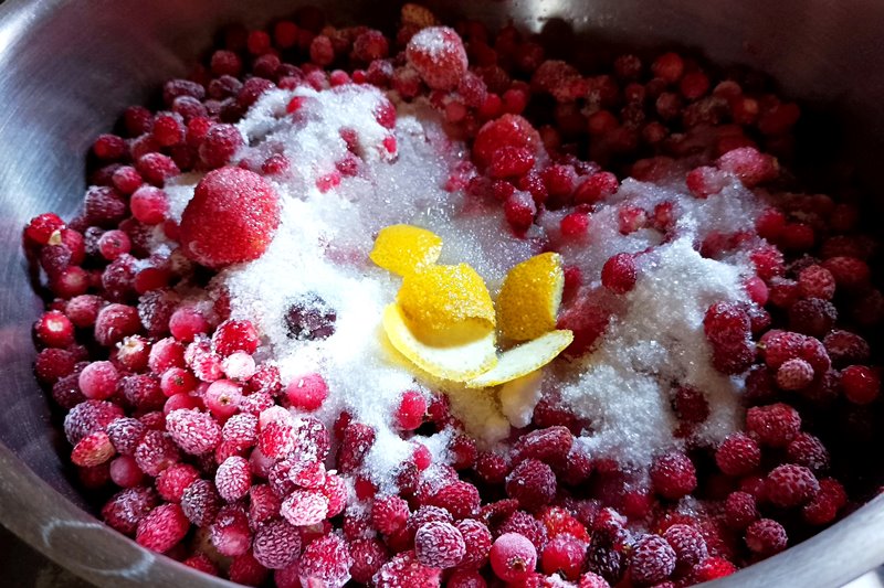 Lavate e asciugate delicatamente i frutti di bosco freschi, oppure, se li avete congelati o acquistati surgelati, lasciate scongelare a temperatura ambiente; unite tutti i frutti di bosco in una casseruola, aggiungete la scorza e il succo di limone, e lo zucchero; mescolate e mettete a cuocere a fiamma bassa, mescolando ogni tanto. Potete decidere se lasciarla con alcuni pezzi interi, o frullarla per renderla omogenea;