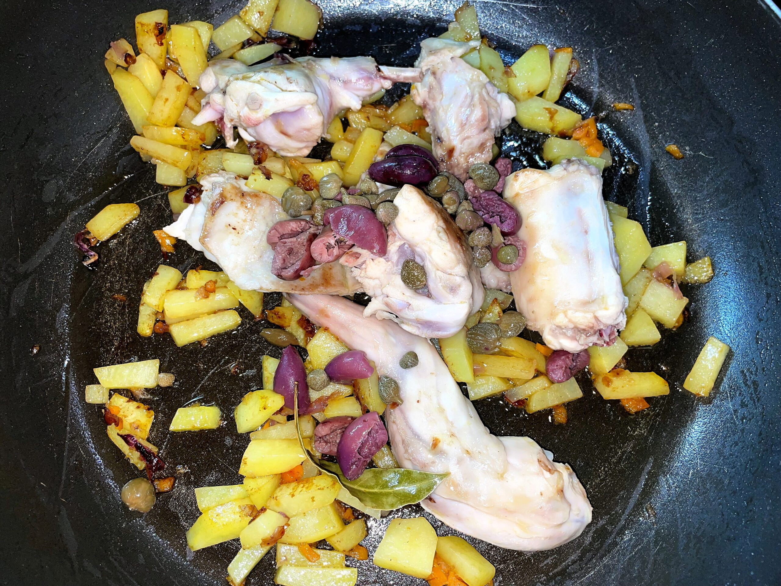 Aggiungetele al soffritto, e fate rosolare in maniera omogenea per tre minuti, poi il coniglio e infine sfumate con il vino bianco. A questo punto unite le olive denocciolate, i capperi,