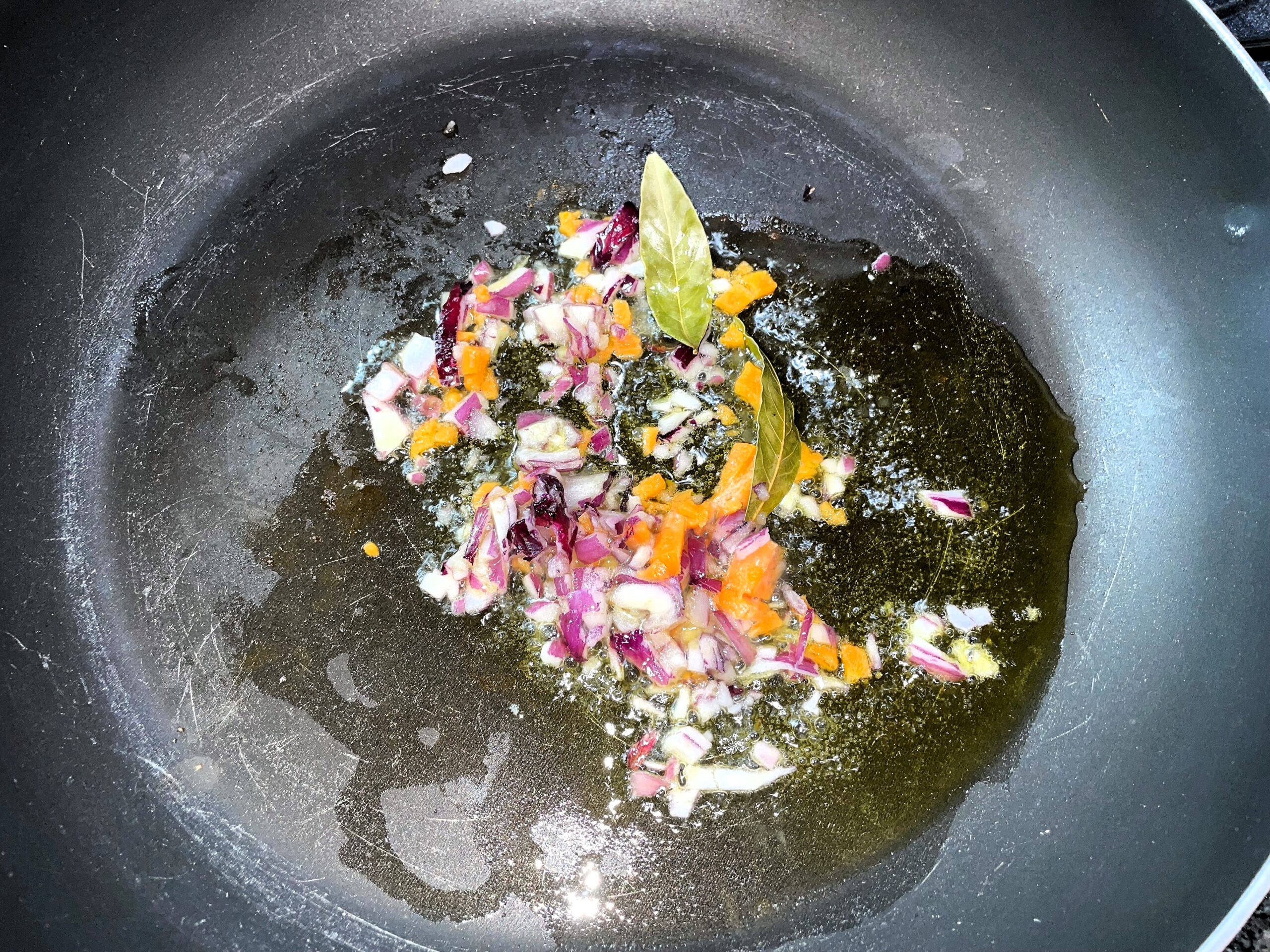 Nel frattempo tagliate a fettine sottili la cipolla e la carota. Mettete un paio di giri d’olio evo in una capiente padella, aggiungete la cipolla, la carota e le foglioline di alloro. Fate soffriggere per un paio di minuti.