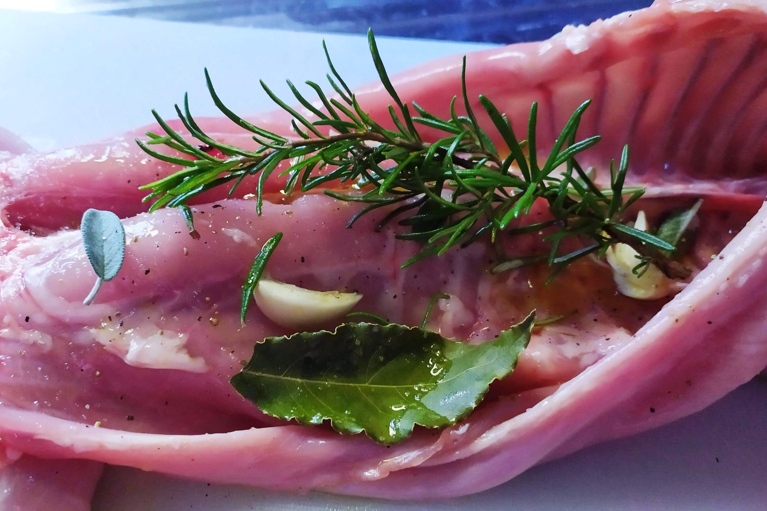 In una ciotola con poco d’olio mettete tutti gli aromi freschi tritati, spezie, sale e pepe, e mescolate. Lavate accuratamente il coniglio, e farcitelo cospargendo la pancia con il trito di aromi e spezie, alloro, un rametto di rosmarino e un limone. Richiudetelo con stecchini e legatelo con spago da cucina. Asciugate la parte esterna, spalmate con un velo d’olio aromatizzato e cospargete con erbe essiccate, sale e pepe, aglio: questa operazione, grazie alla totale assenza di umidità, alla temperatura già alta e il velo di unto capace di veicolare meglio il calore, farà “friggere” la pelle formando la classica crosticina saporita e croccante.