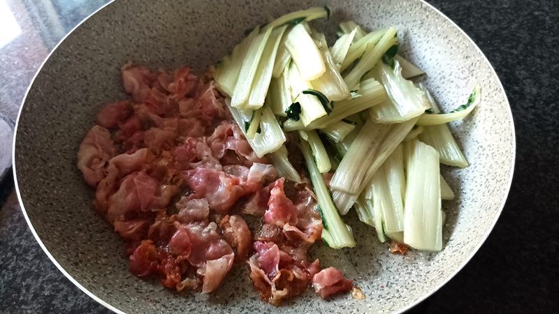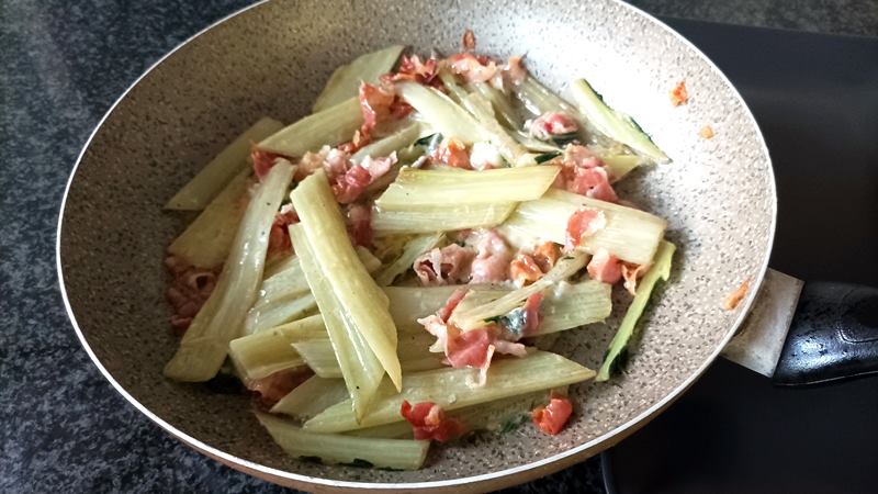 Unite le coste sbollentate alla pancetta. Aggiustate di sale (con parsimonia, gli altri ingredienti sono già sapidi) e pepe. Fate saltare il tutto per un paio di minuti a fiamma media per far insaporire bene la verdura.