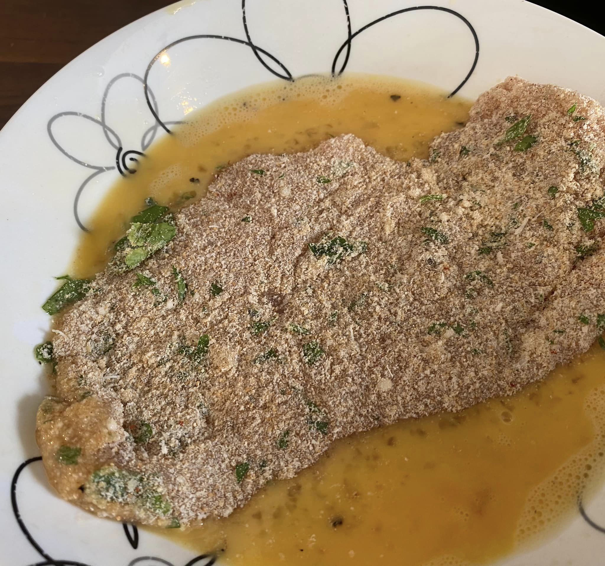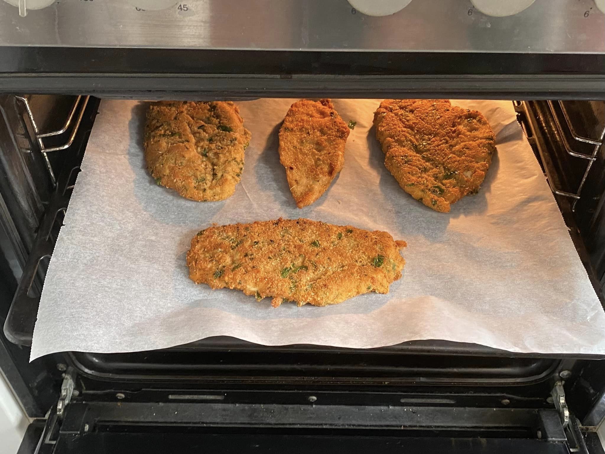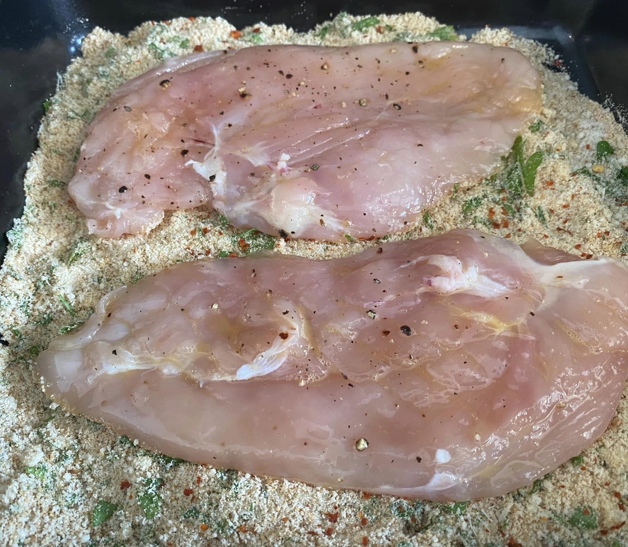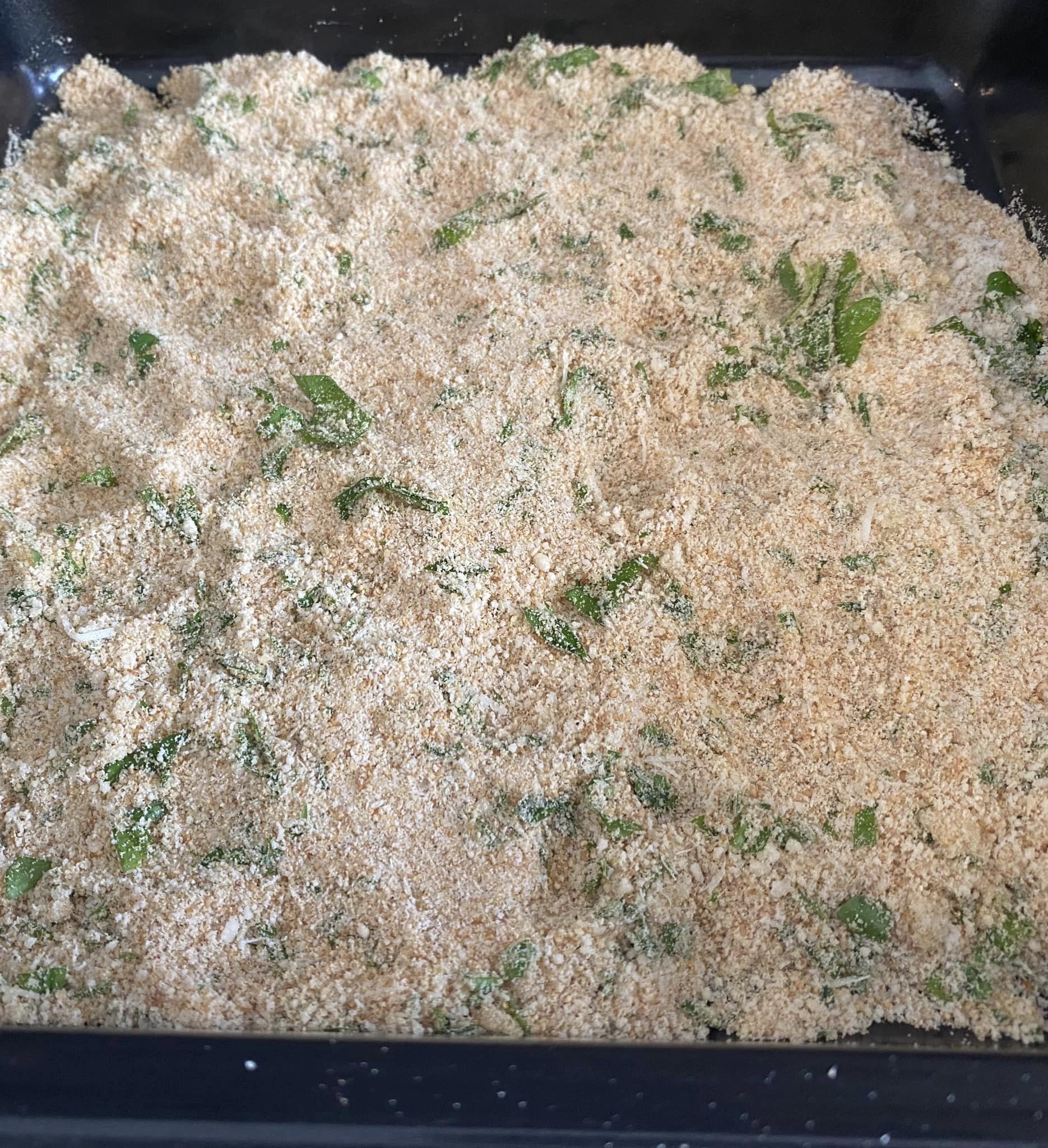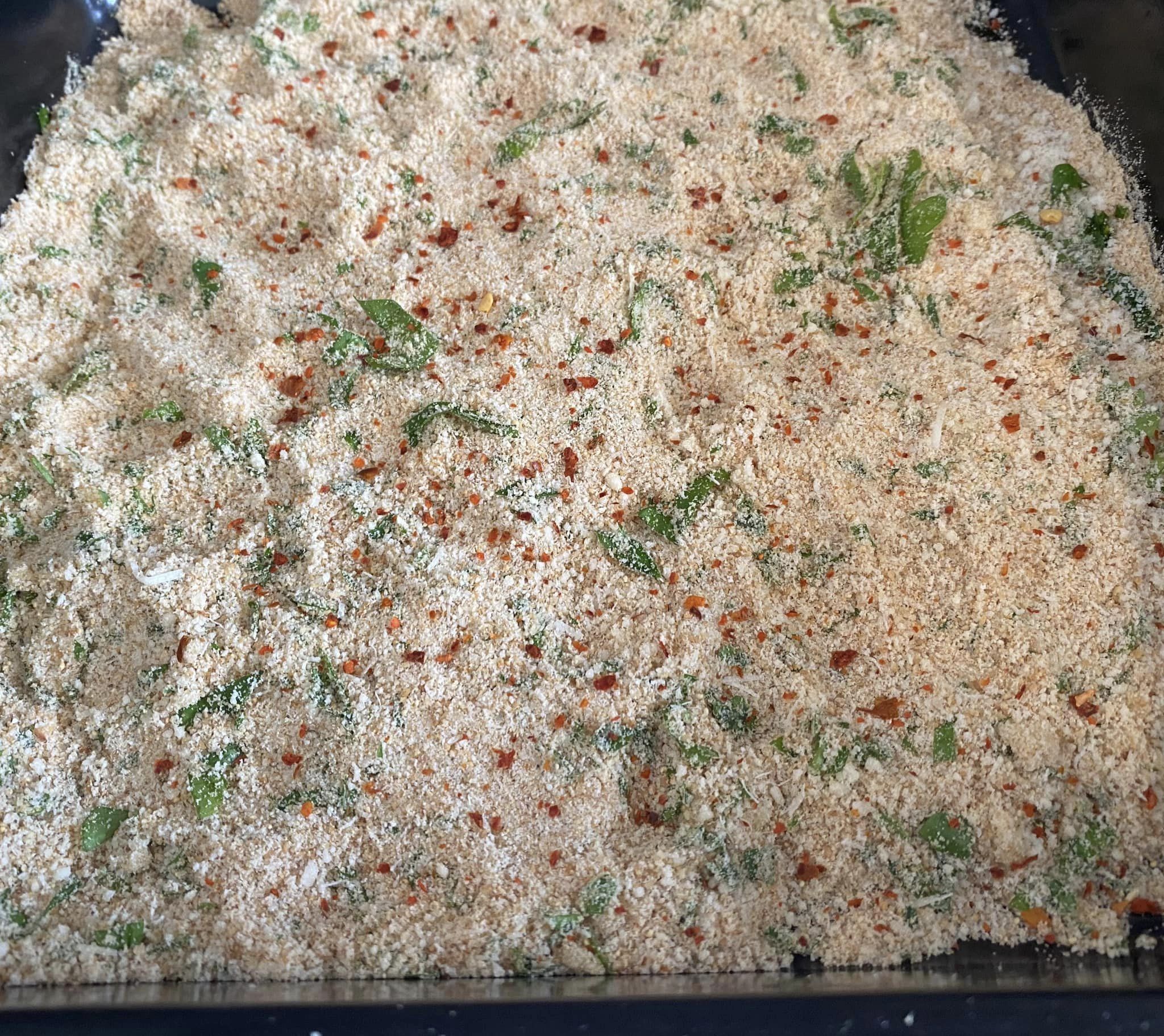 Saliamo e pepiamo quanto basta. Intanto prepariamo la panatura: pangrattato, parmigiano, aglio tritato finemente, spolveriamo con del prezzemolo e con delle scaglie di peperoncino per chi piace ed amalgamiamo il tutto.