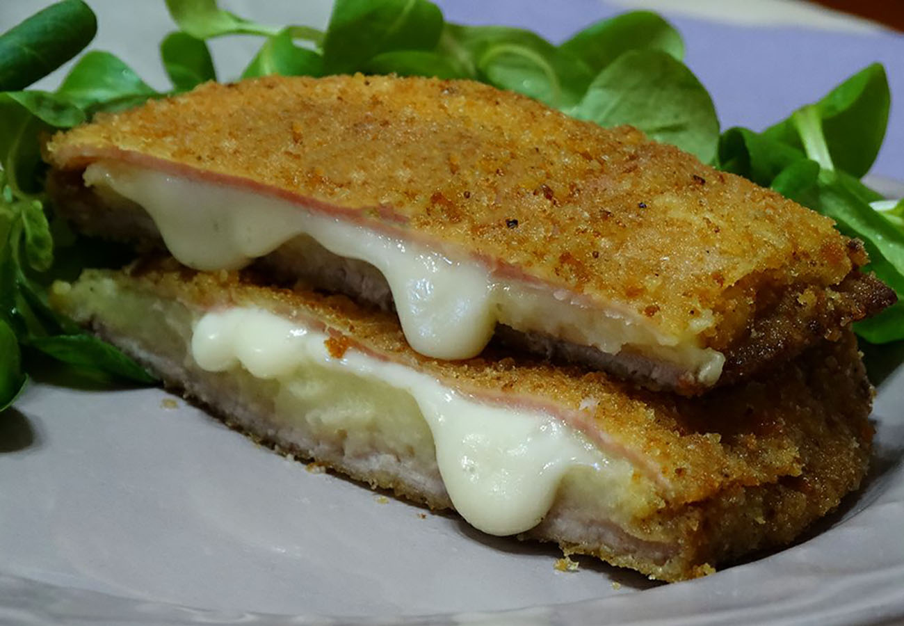 Aggiungete qualche pizzico di sale e pepe e mescolate bene. Ponete le fette di lonza fra 2 fogli di carta forno e assottigliatele utilizzando un batticarne, poi incidete i bordi per fare in modo che la carne non si arricci in cottura. Distribuite la purea di patate su 4 fette di lonza, lasciando circa 1 cm di bordo libero; distribuite sulle patate il formaggio tagliato a fette e il prosciutto, poi coprite con le altre 4 fette di carne.