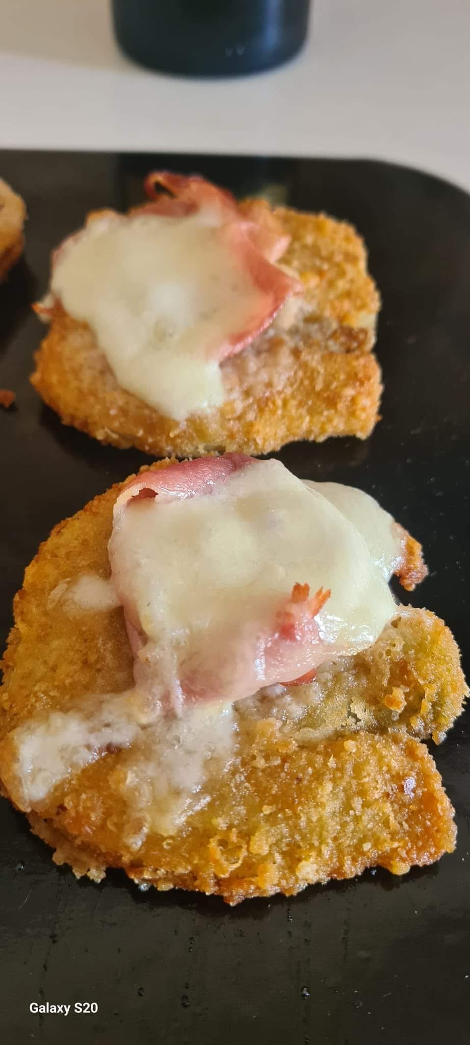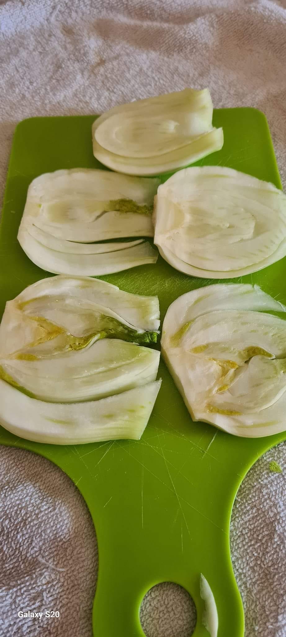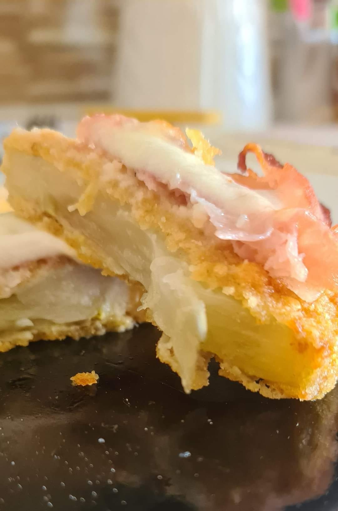 Successivamente Cuocere le cotolette: Disponete le fette di finocchio impanate su un foglio di carta forno. Spruzzatele o spennellatele con un filo d’olio extravergine d’oliva. Cuocete in friggitrice ad aria a 175°C per 18-20 minuti , girandole a metà cottura, finché saranno dorate e croccanti. Infine Farcire e ultimare la cottura: Una volta dorati, farcite metà delle cotolette con una fetta di provola e una di prosciutto cotto (o speck). Sovrapponete un’altra cotoletta come se fosse un panino. Infornate di nuovo a 180°C per 3-5 minuti , fino a quando il formaggio sarà completamente sciolto. Servite le cotolette di finocchi alla valdostana ben calde, accompagnate da un’insalata fresca o da un contorno di patate al forno. Buon appetito!