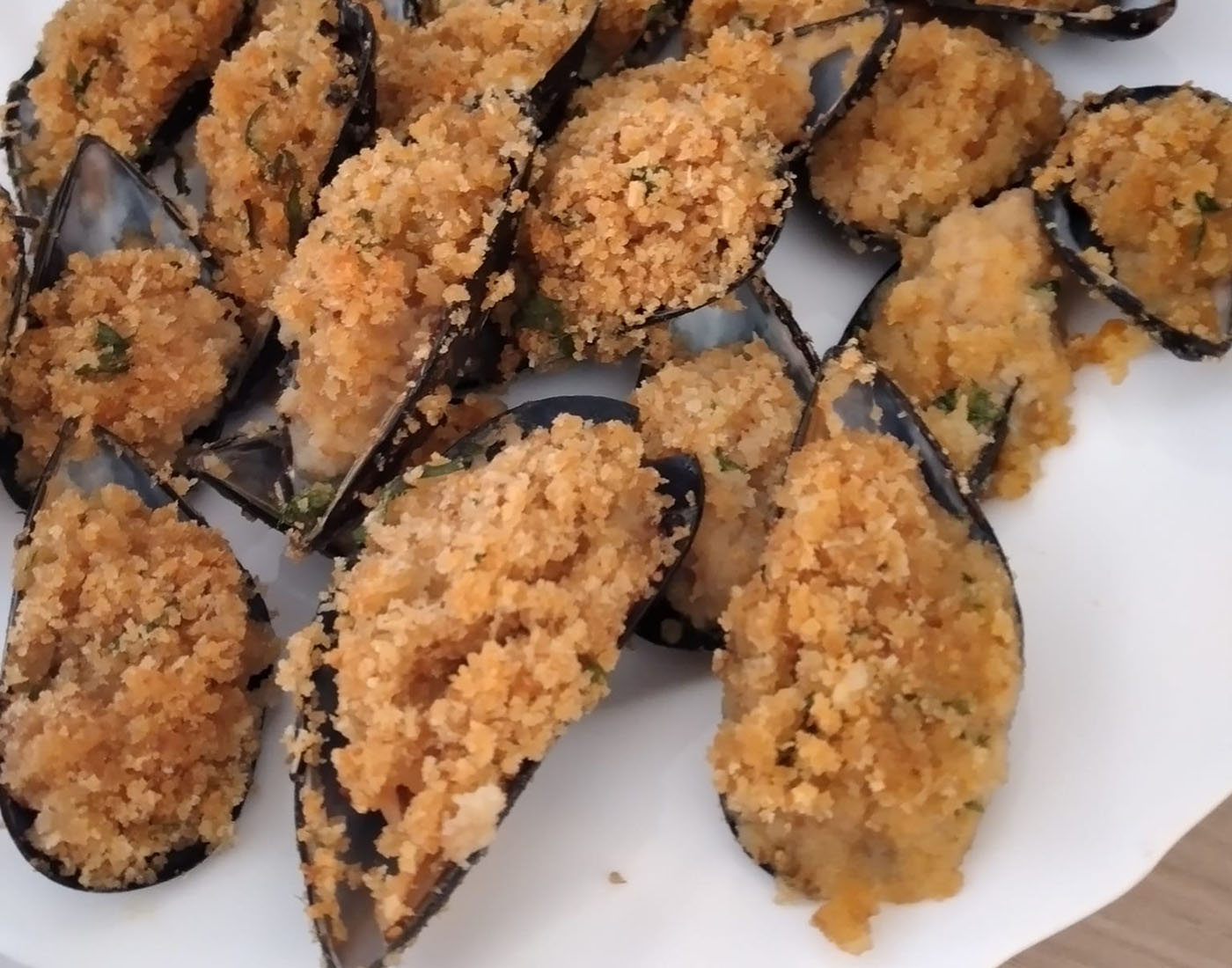 Disponiamo le cozze in una teglia foderata con carta forno, con il lato aperto rivolto verso l’alto. Distribuiamo la panatura su ciascuna cozza, premendo leggermente per farla aderire bene. Condiamo con un filo d’olio e informiamo a 200°C per circa 10 minuti in modalità grill, fino a doratura. Le serviamo ben caldo, con una spruzzata di succo di limone e magari accompagnato da un buon bicchiere di vino bianco fresco. Semplici, croccanti e saporite… queste cozze gratinate faranno felici tutti! Buon appetito!