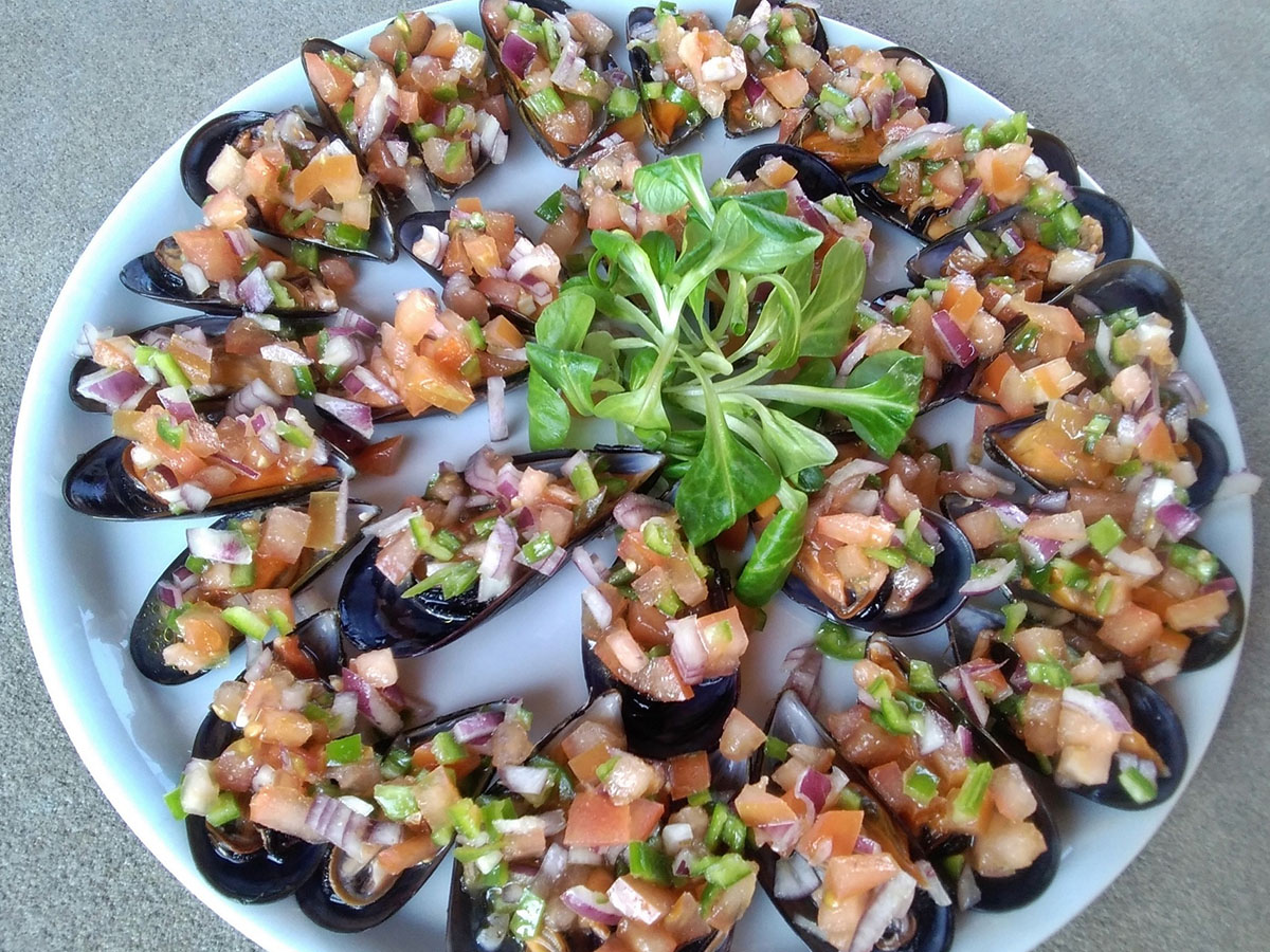 Cozze ripiene di insalata di verdure crude