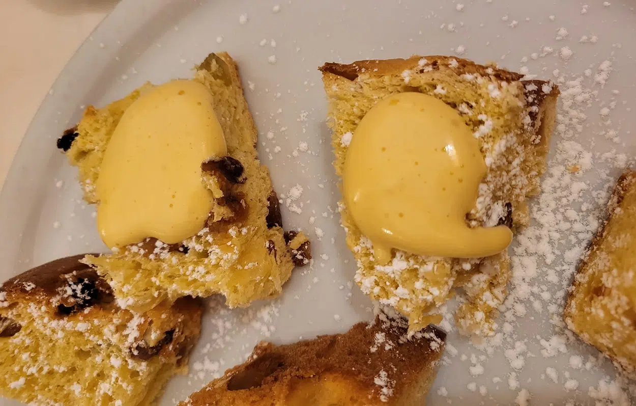 Taglia il pandoro o panettone a fette orizzontali e spalma la crema tra gli strati, oppure servila in una ciotolina accanto alle fette di pandoro. Spolverizza con zucchero a velo prima di servire.