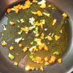 In una capiente padella, mette un giro d’olio evo, tritate ed unite all’olio evo, il sedano, la carota e la cipolla, fate rosolare per un minuto.