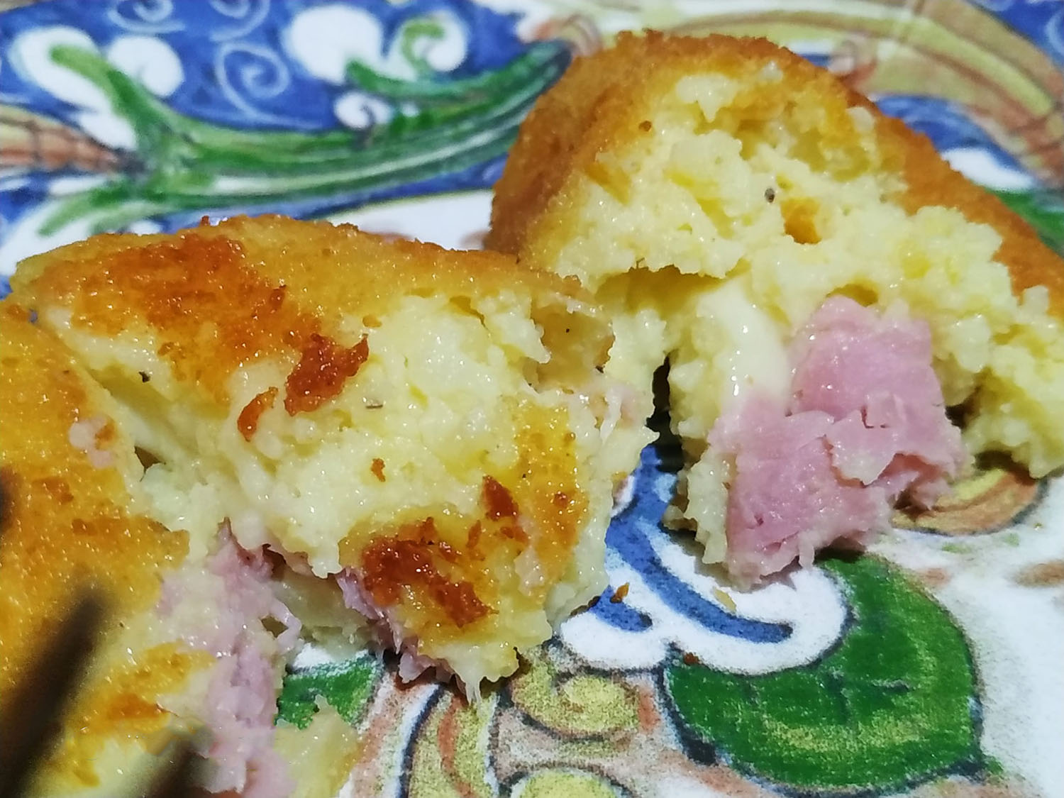 La prima cosa da fare per preparare le crocchette di patate di Antonino Cannavacciuolo è lessare le patate in abbondante acqua bollente e salata per 40 minuti. Scolatele e sbucciatele subito. Passatele nello schiacciapatate per ottenere una purea. Condite con olio extravergine di oliva, sale e pepe. Lasciate raffreddare. Intanto preparate gli altri ingredienti. Grattugiate il parmigiano, tagliate a pezzi il prosciutto cotto e la mozzarella. Unite questi tre elementi alle patate insieme al tuorlo d’uovo e amalgamate bene il tutto. Ricoprite una sac a poche con un boccaglio di 2 centimetri.