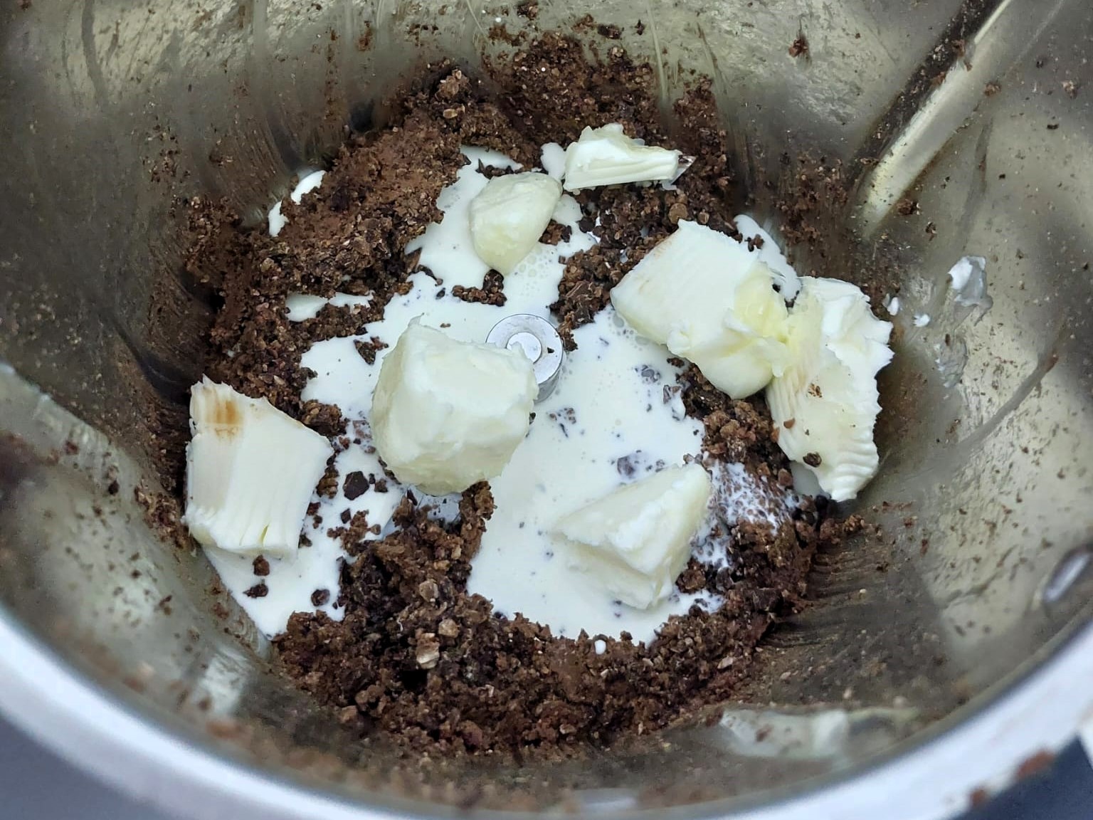 Mettere nel boccale il cioccolato a latte, tritarlo ed aggiungere il burro e la panna, amalgamate il tutto a 50°, in alternativa potete aggiungere al cioccolato e alla panna il burro fuso.