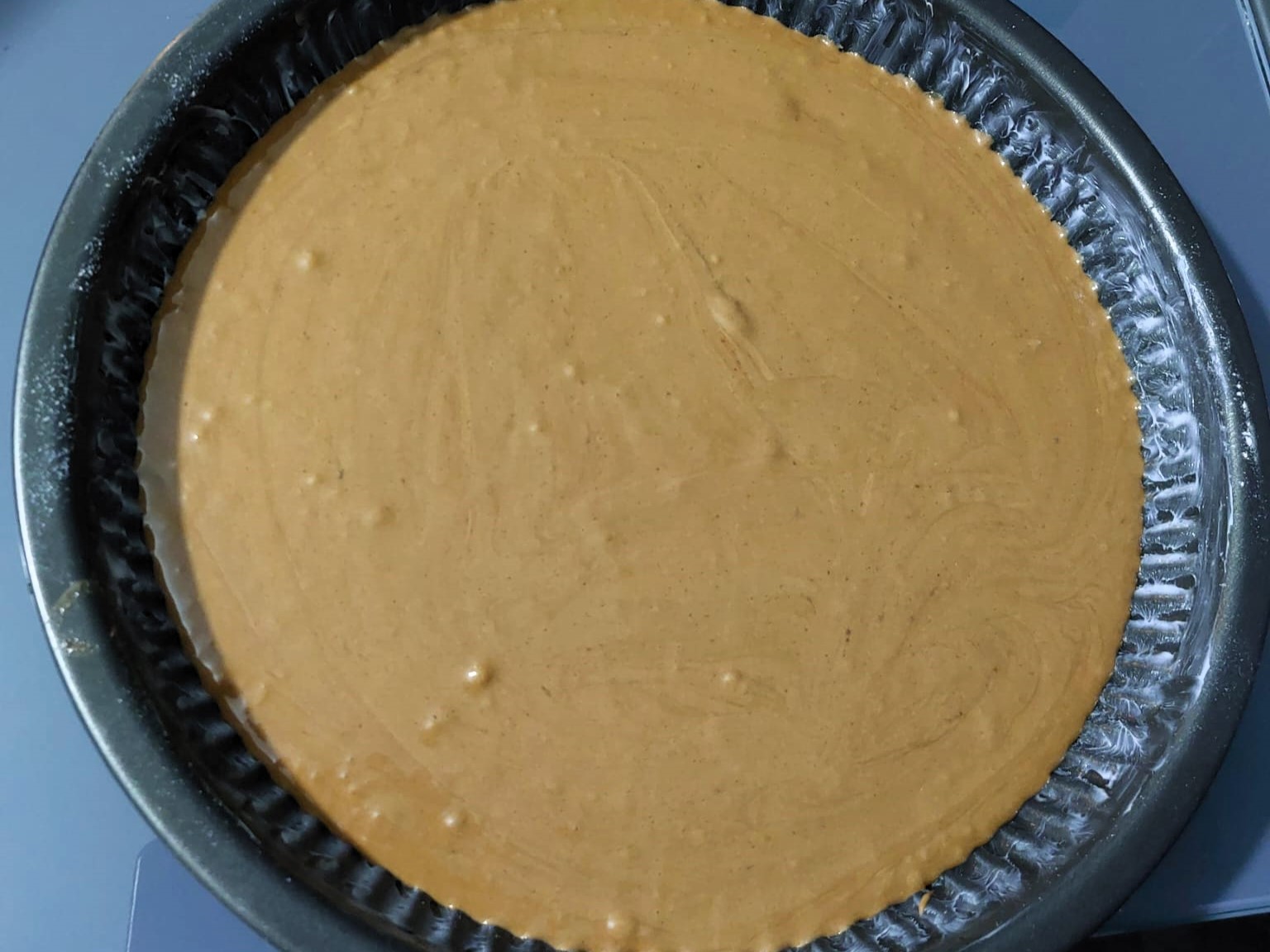 Imburrate ed infarinate una tortiera, da 28 cm, versate e livellate il composto.