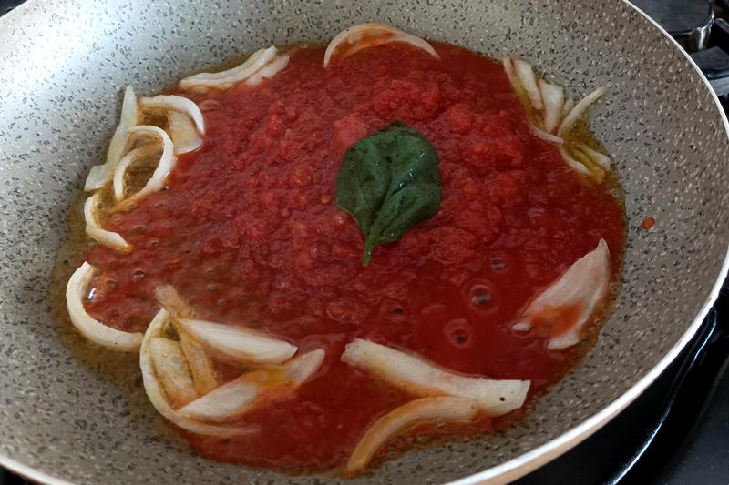 Tagliate le fette di pane e fatele tostare dai due lati, in padella per 5 minuti. Fate rassodare le uova cuocendole per 10 minuti dal bollore, fatele raffreddare sotto ad acqua fredda e tagliatele a fettine. In una padellina fate arrostire 5 minuti i pomodorini tagliati a metà, con un pizzico di sale, e metteteli da parte. Nella stessa padella rosolate la cipolla tagliata a fettine con un filo d’olio, aggiungete la polpa di pomodoro, una foglia di basilico ed un pizzico di sale, e fate restringere per 5 minuti.