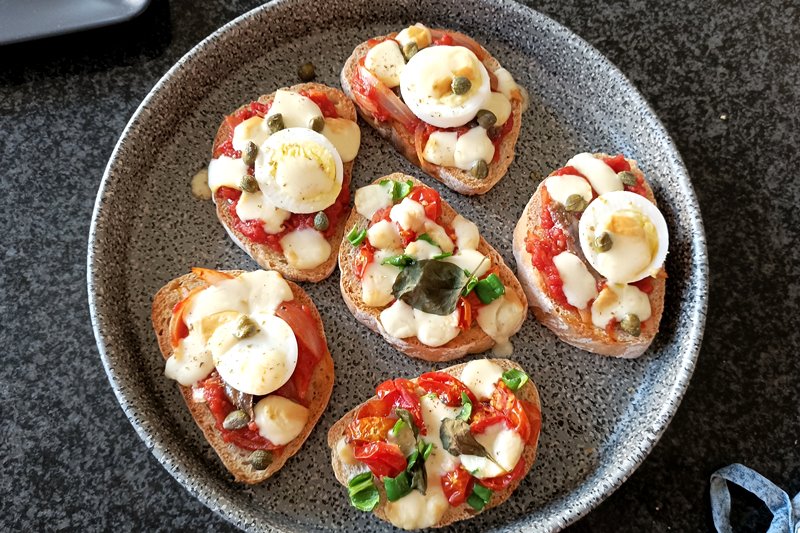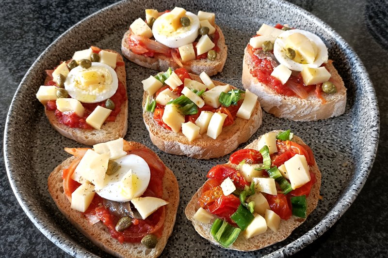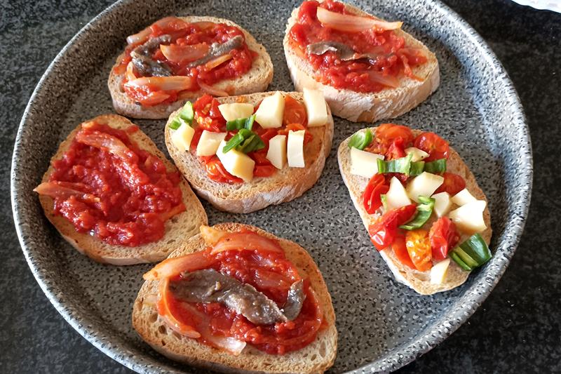 Cospargete il sugo di pomodoro con le cipolle su ognuno dei 4 crostoni, aggiungete un’acciuga, qualche cappero, fettine di uova e cubetti di scamorza tagliata a cubetti, infine un giro d’olio ed una spolverata di origano. Negli altri 4 crostoni mettete i pomodorini, il peperoncino tagliato a pezzetti, cubetti di scamorza tagliata a cubetti, e foglie di basilico, un giro d’olio ed una spolverata di origano. Mettete i crostoni saporiti in una teglia ed infornate sotto al grill a 220°C per minuti, fino a che il formaggio si sarà sciolto: traferite in un vassoio ed eccoli pronti da gustare!