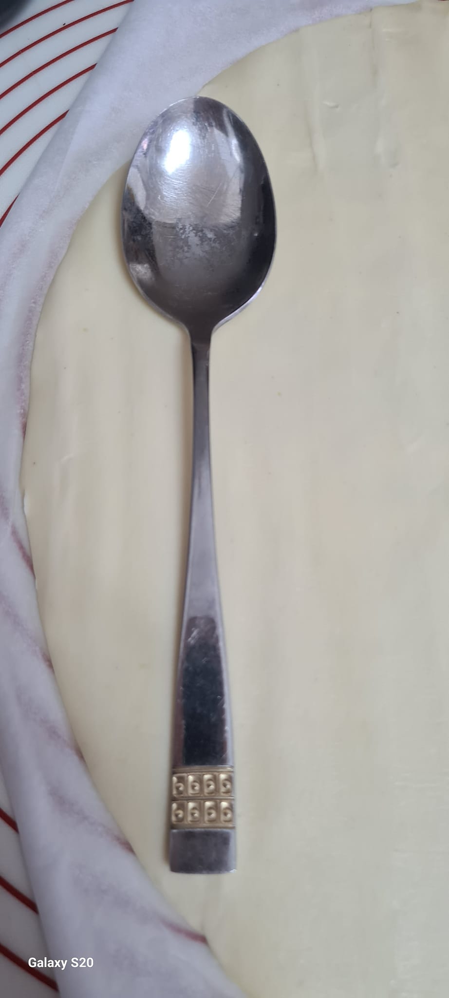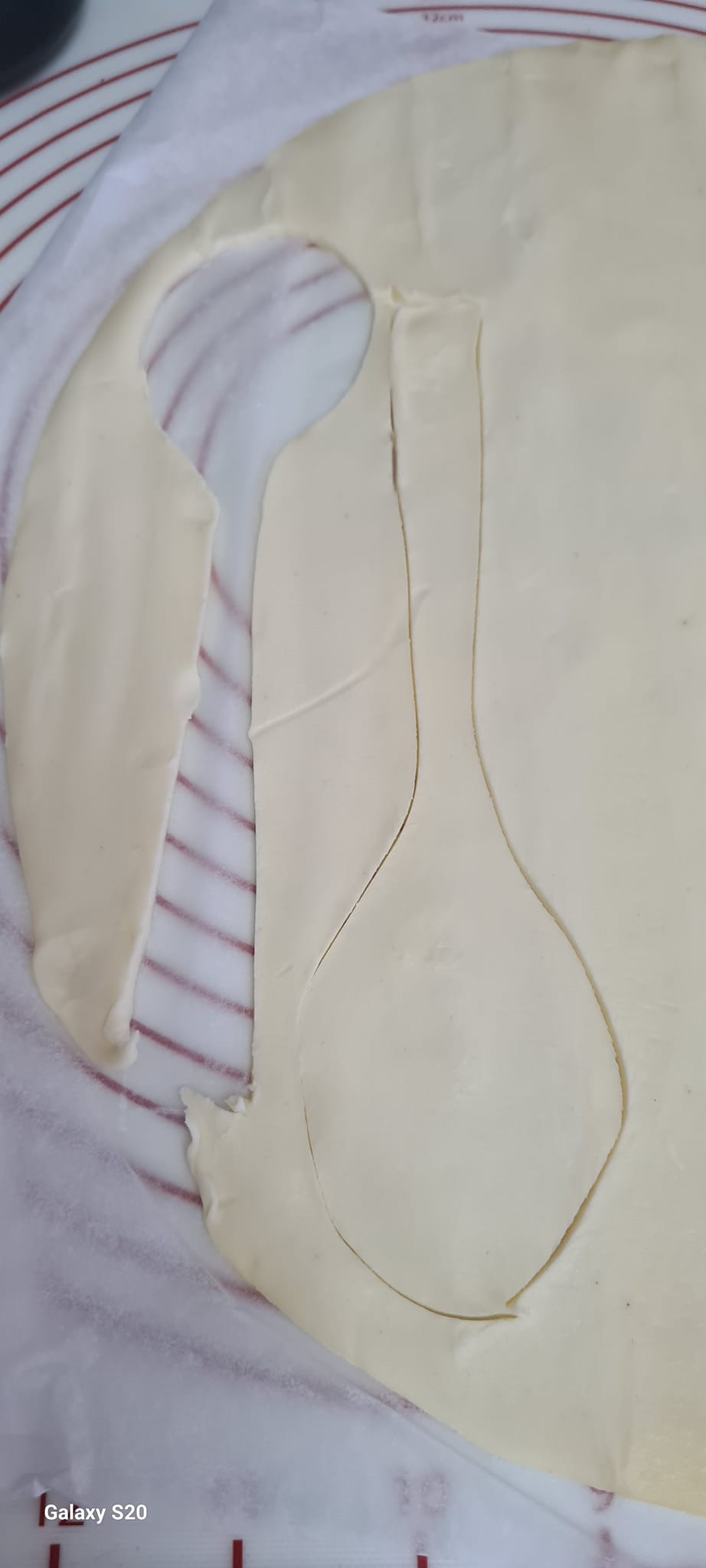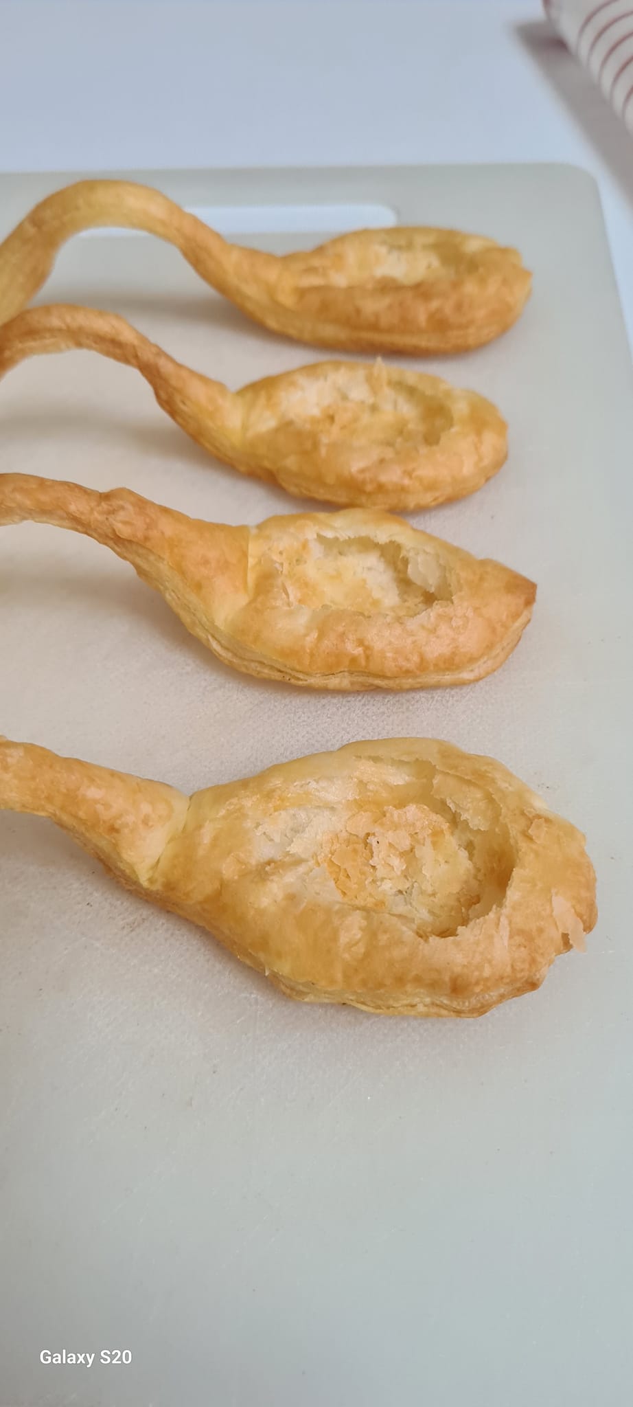 Iniziamo con il Preparare la base di sfoglia: Stendete la pasta sfoglia su una superficie piana. Posizionate un cucchiaio sopra la sfoglia e, con un coltello affilato, incidete intorno alla forma del cucchiaio per ottenere una sagoma. Ripetete fino a esaurire la pasta. Ora bisogna Creare la forma concava: Avvolgere un cilindro di cartone (come il tubo della carta del forno) con fogli di alluminio per creare una base sicura. Disponete il sagome di sfoglia sopra il cilindro in modo che si curvino, assumendo la forma di un cucchiaio.