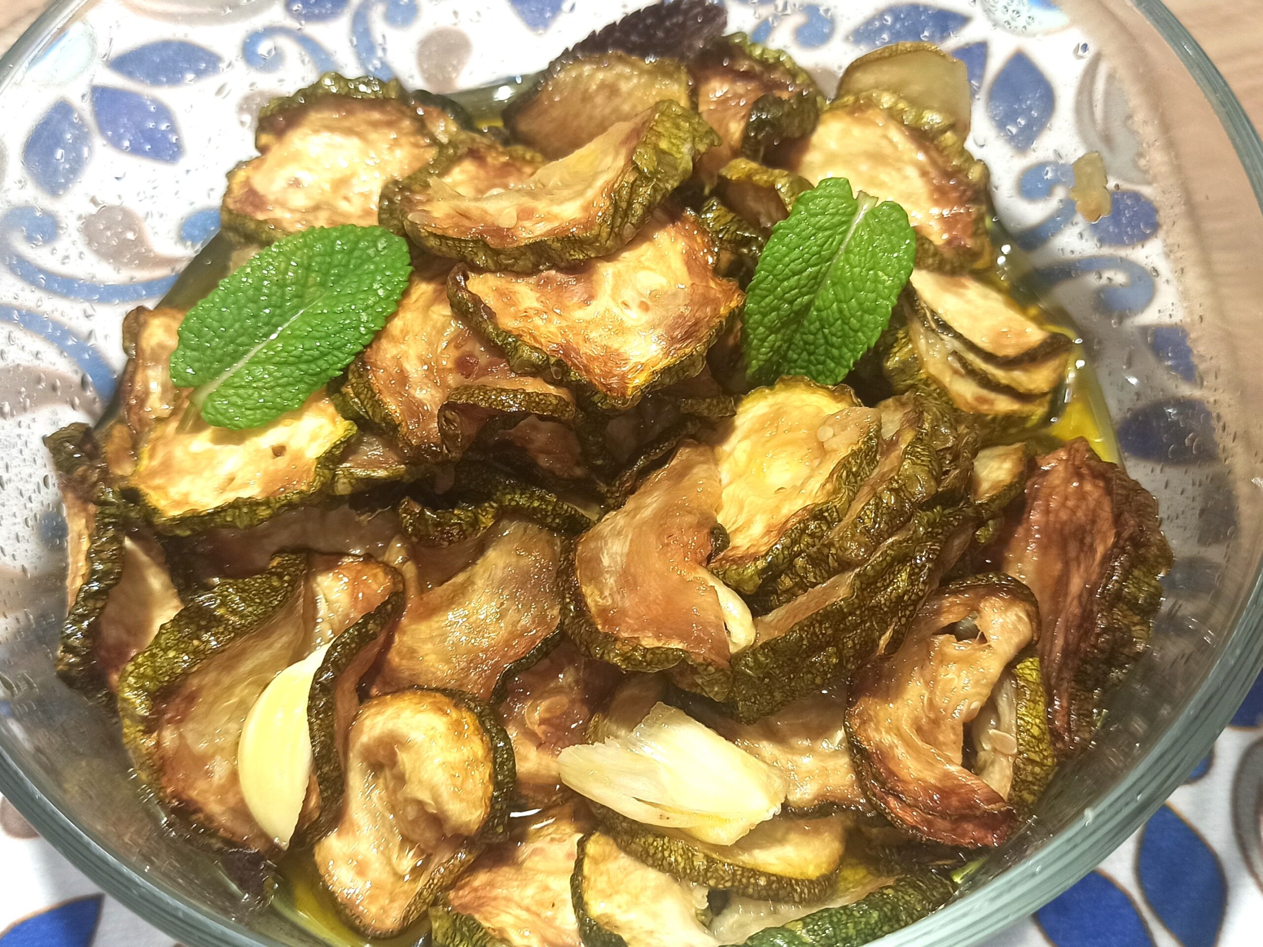 Scaldate l’olio in una capiente padella, e friggete le zucchine, poche alla volta, in modo da non abbassare la temperatura dell’olio. Mano a mano che sono pronte mettetele in una ciotolina. Quando tutte saranno fritte, preparate l’emulsione, tagliate l’aglio a pezzetti e mettetelo in una ciotolina, insieme alle foglioline di menta, l’aceto, il sale e un filo d’olio evo, mescolate con una forchetta. Condite le zucchine, e lasciate riposare in frigo, almeno un paio d’ore prima di servire e gustare.