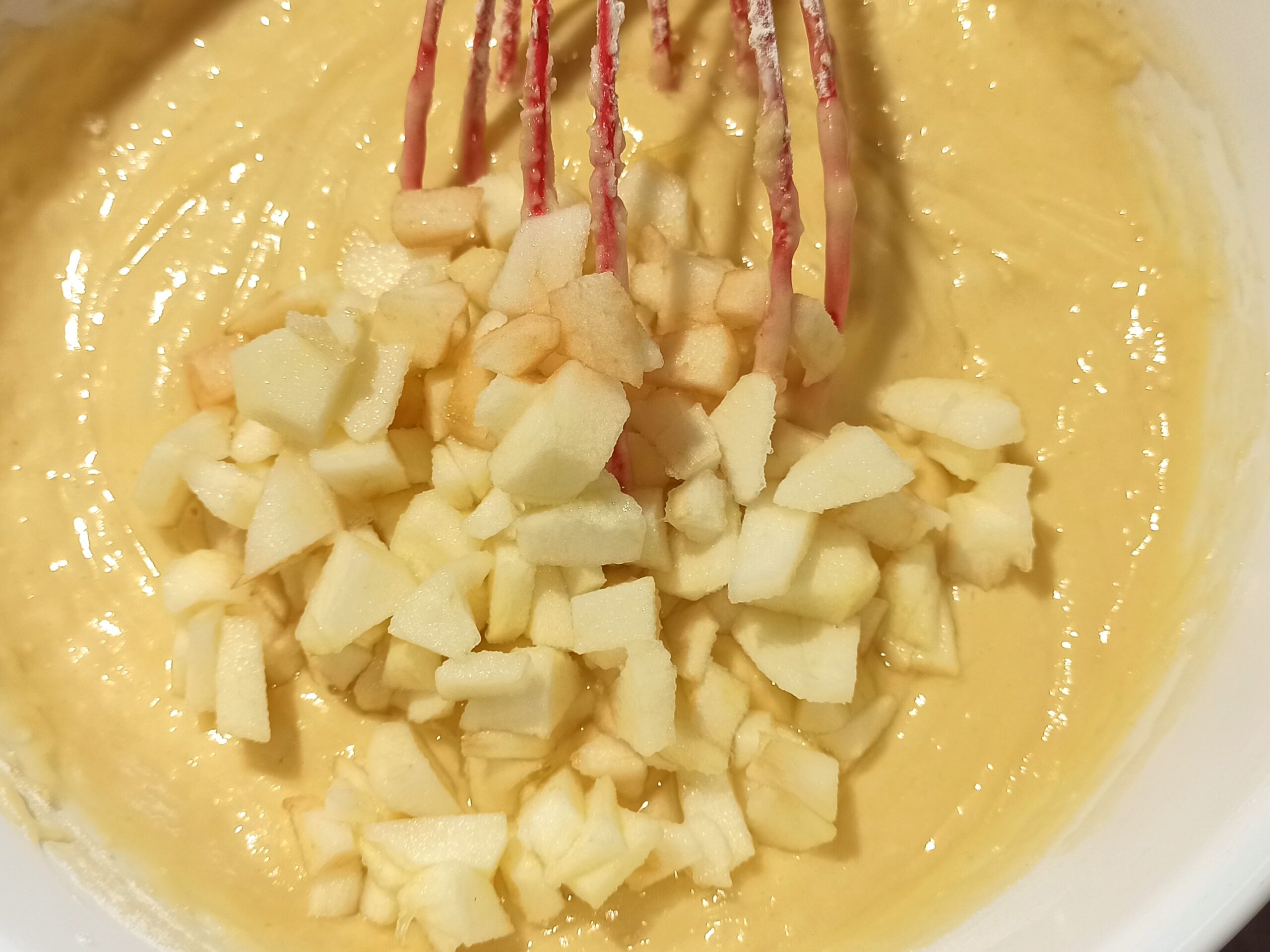 Aggiungete le mele, mescolate ancora, per fare amalgamare bene le mele all’impasto.