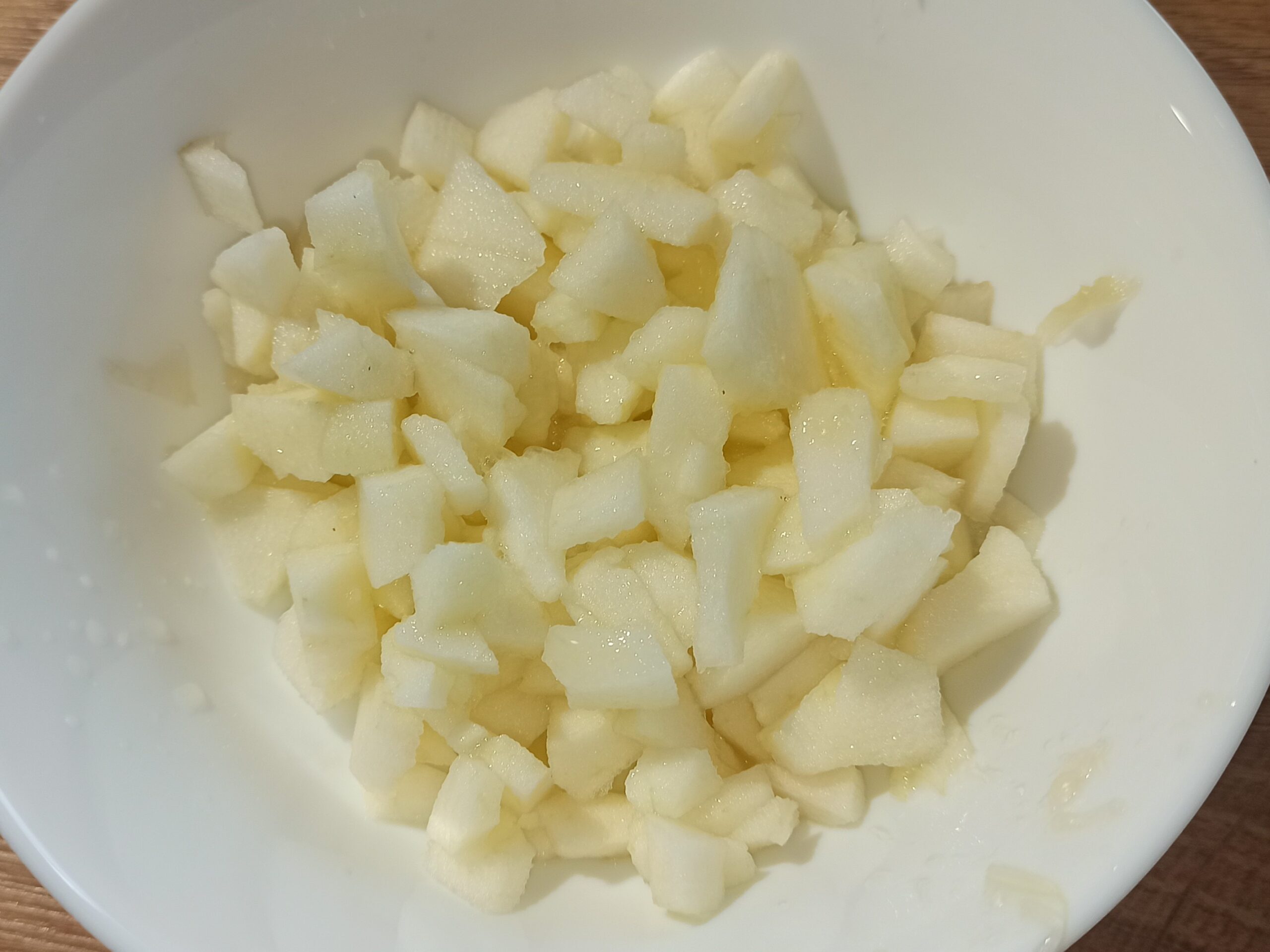 Per preparare le cupolette alle mele e amarena, iniziate a lavare e sbucciare le mele. Tagliatele a pezzettini, mettetele in una ciotola ed irroratele con il succo del limone.