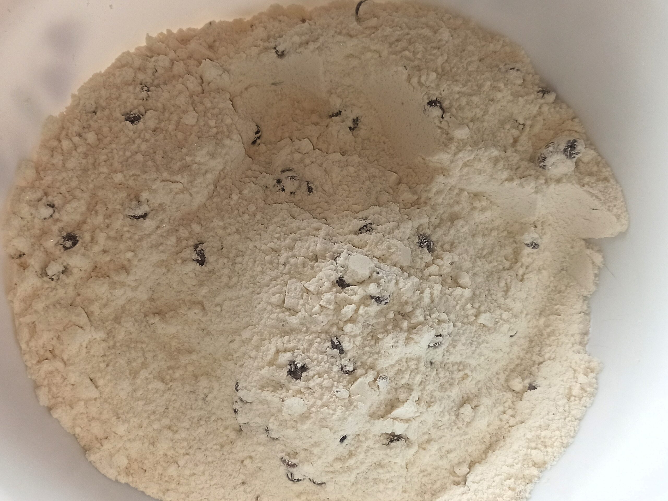 In una ciotola, mescolate, lo zucchero, la farina, lievito per dolci, il pizzico di sale, e le gocce di cioccolato, conservandone alcune per decorare la superfice.