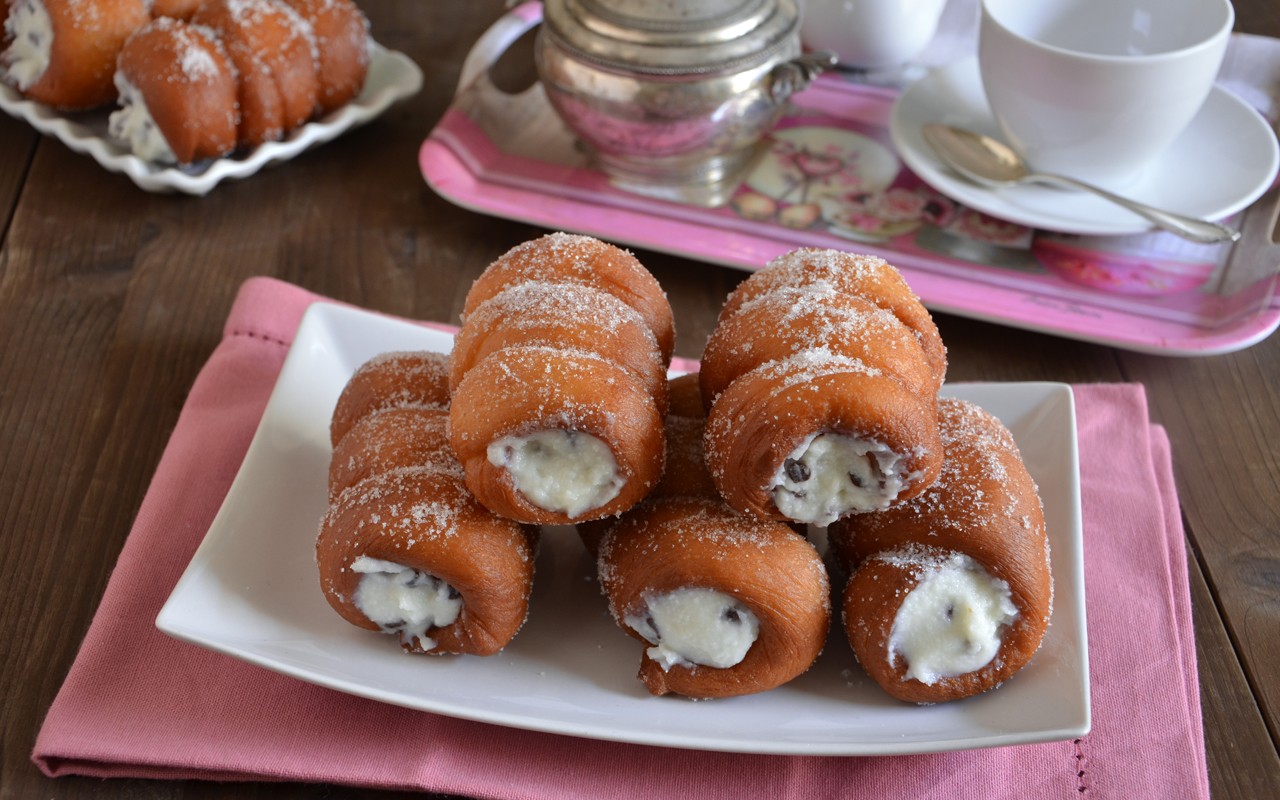 Tenete in frigorifero per 4 ore. Trascorso il tempo, unite le gocce di cioccolato, mescolate e rimettete in frigorifero. Riprendiamo l’impasto e formiamo dei panetti da 75 grammi l’uno. Allungateli roteandoli sul piano a formare dei cilindri lunghi 30 centimetri. Prendete i cilindri per cannoli e arrotolatevi la pasta intorno a formare 4 giri. Posizionateli su una teglia rivestita con carta da forno e fateli lievitare ancora un’ora. Friggeteli in abbondante olio di semi di girasole. Scolateli su carta assorbente, rimuovete il cilindro per cannoli e passate i dolcetti nello zucchero. Trasferite la ricotta nella sacca da pasticciere e riempite. I vostri cartocci ripieni fritti sono pronti.