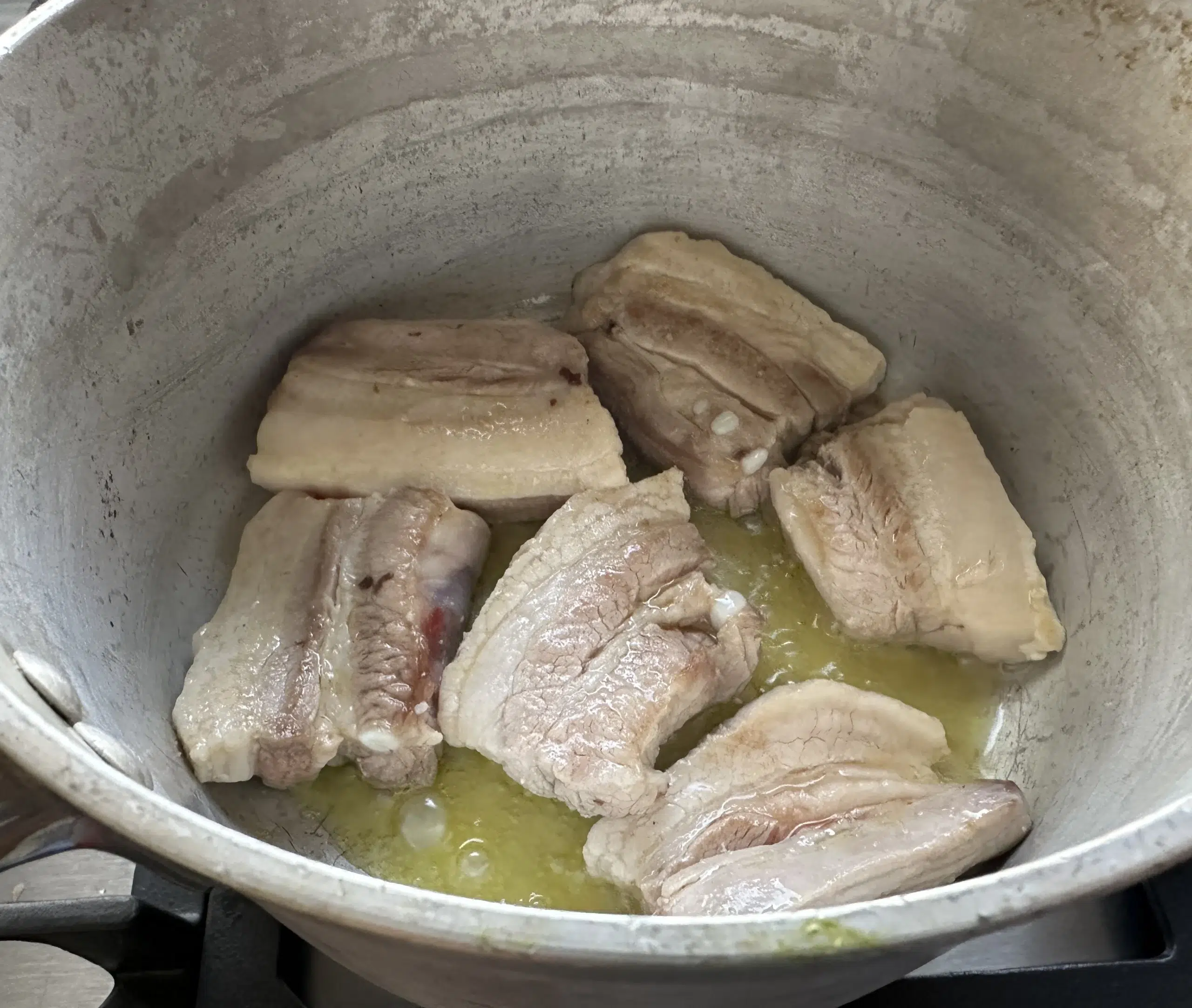 Procediamo per prima cosa dalla carne. La facciamo rosolare bene in un filo di olio ( non tanto perché le costine tendono a rilasciare tanto grasso). Fatto questo, quindi lasciate qualche minuto da un lato e qualche minuto dall’altro ( tutto dipende dalla pentola che usate), le togliete, mettendole in un piatto, e poi, come nella foto, inserite la cipolla tritata finemente ( in maniera tale che alla fine del piatto si sarà sciolta).