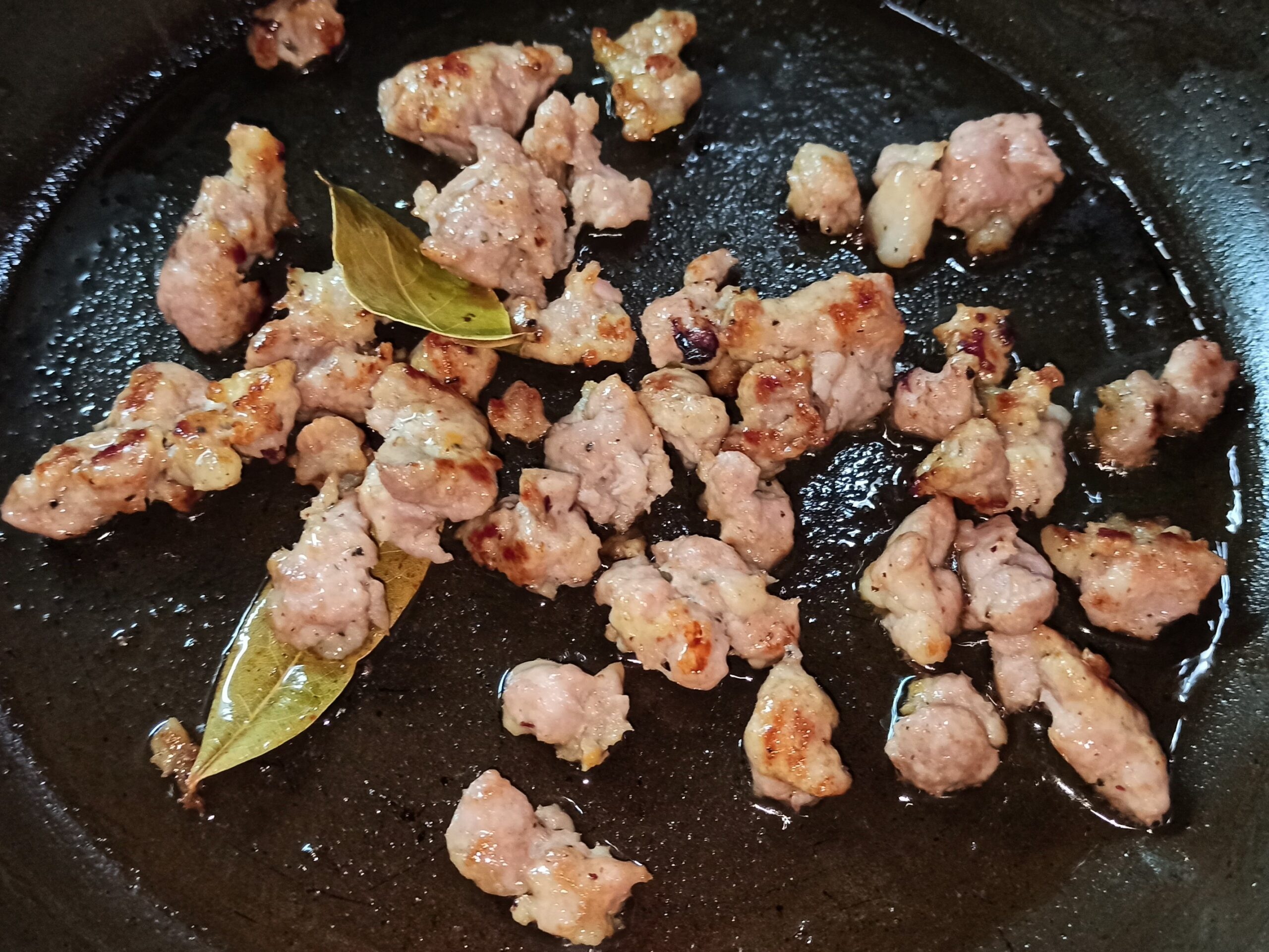 Tritare finemente la cipolla eliminate la pelle della salsiccia e sgranatela. In una capiente padella, mettete un giro d’olio evo, unite la cipolla, la salsiccia e le foglioline di alloro, fate rosolare a fiamma media.
