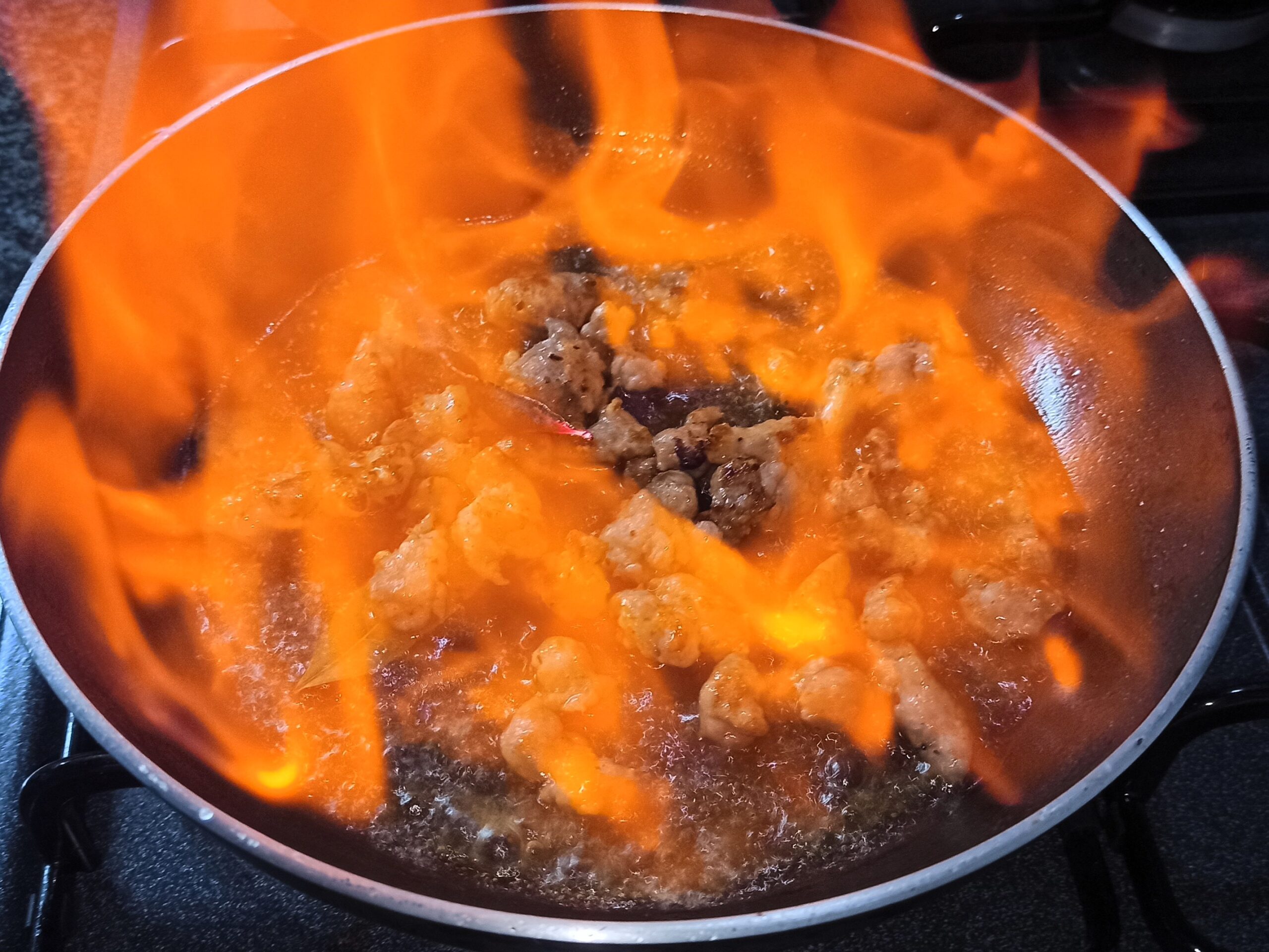 Appena la salsiccia risulterà rosolata, aumentate la fiamma, e aggiungete il cognac, attenzione alla fiammata.