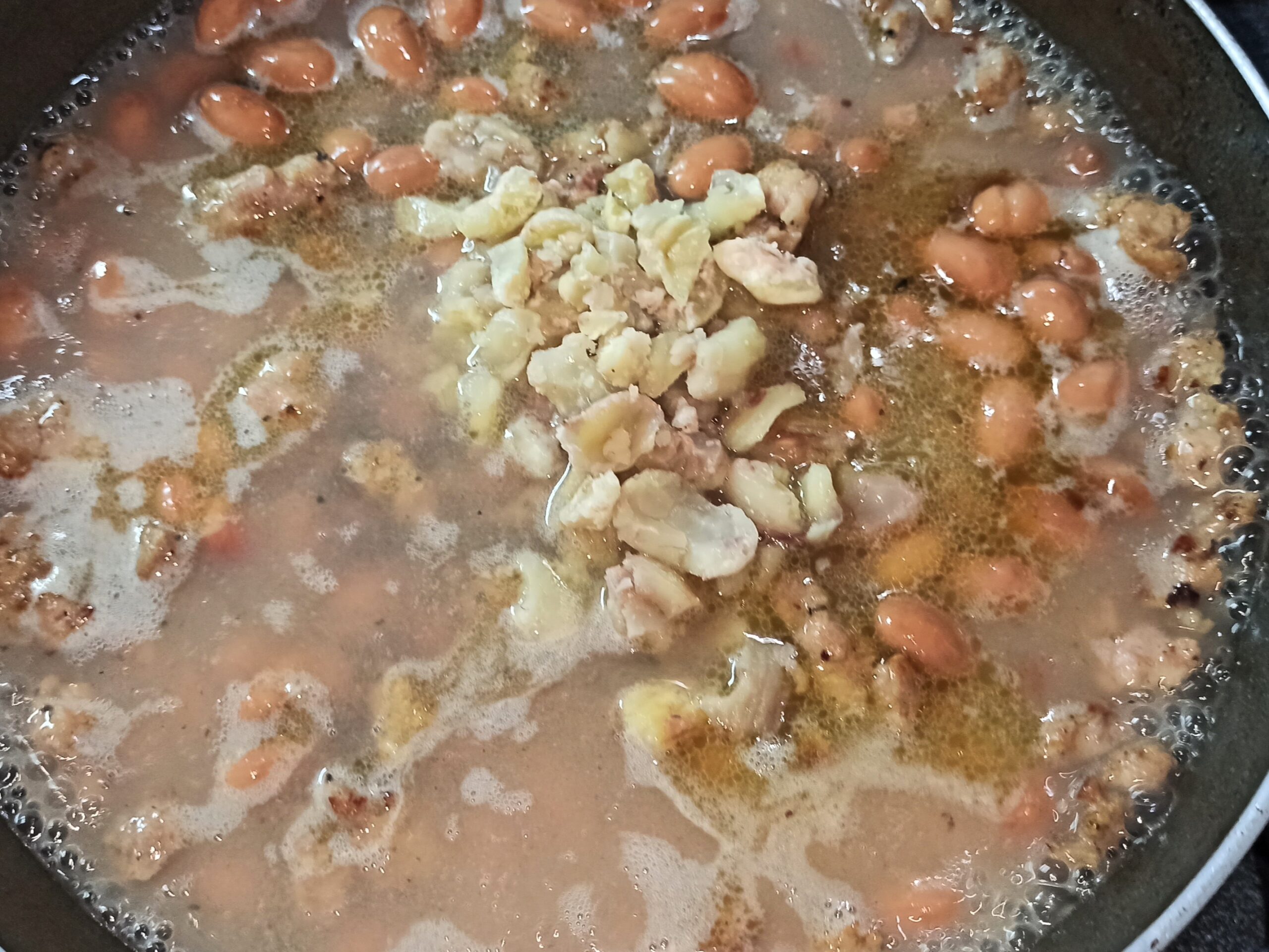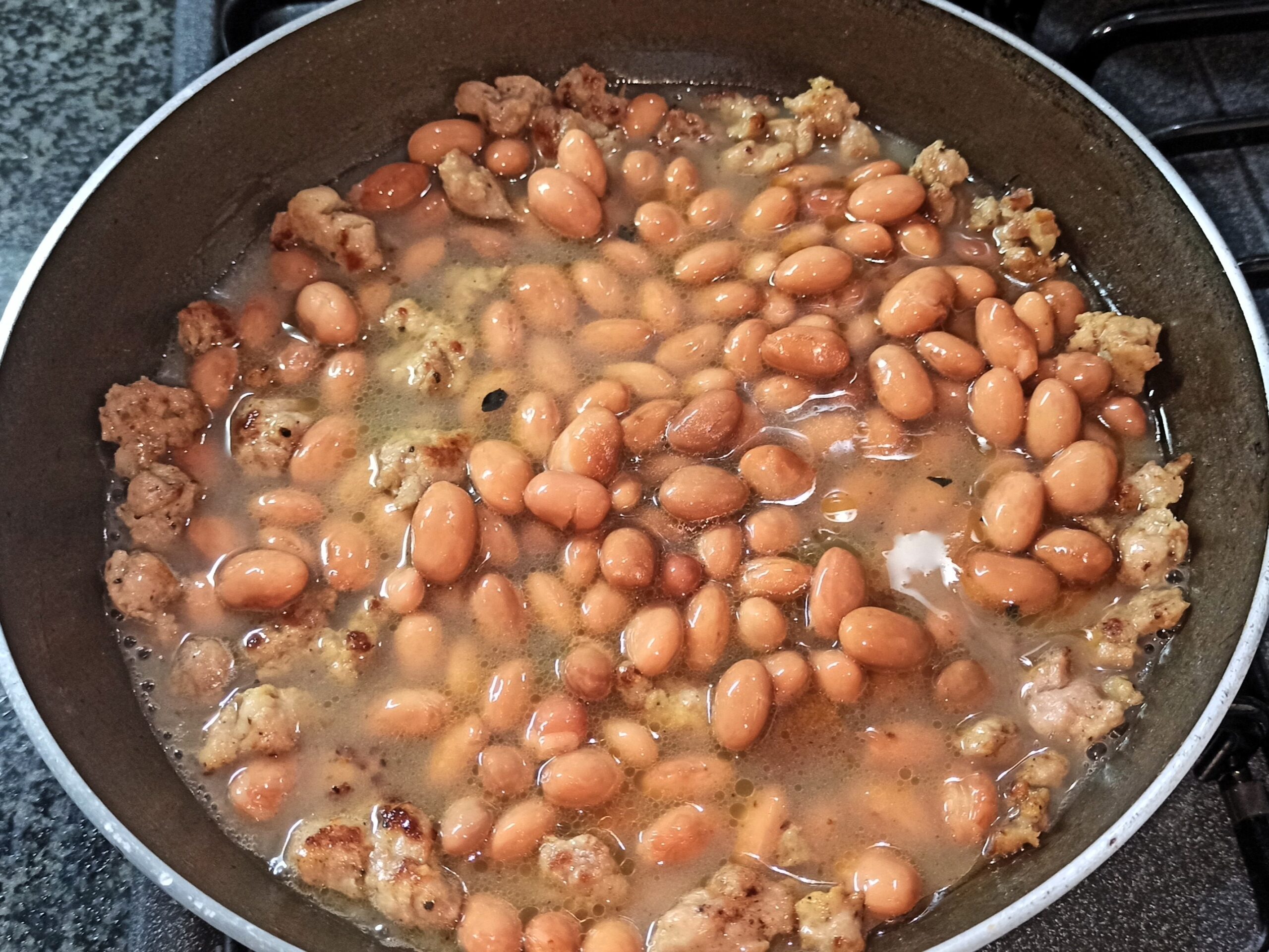 Appena la fiamma si sarà spenta, aggiungete i borlotti, un poco d’acqua, e fate cuocere a fiamma dolce per dieci minuti.