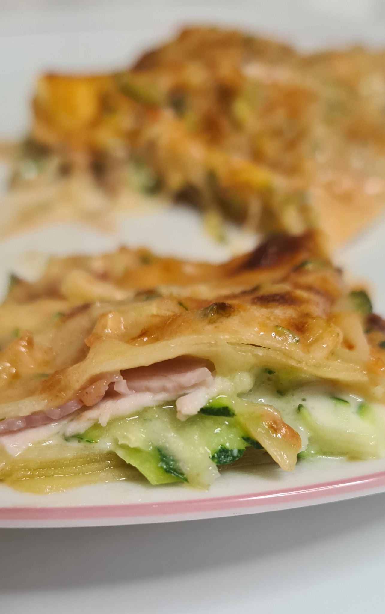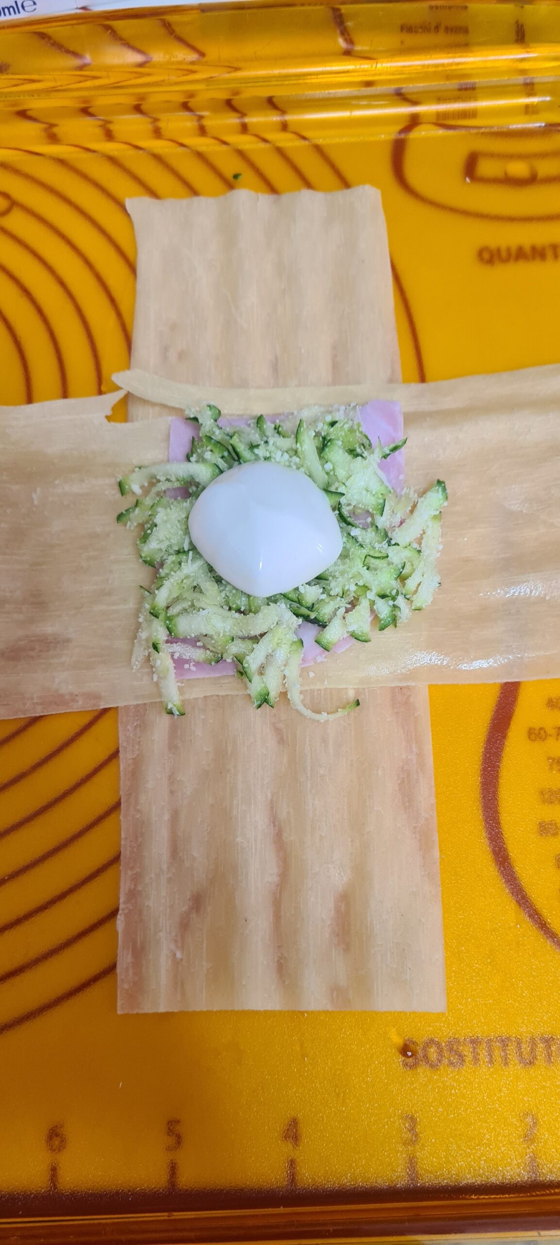 Dividere ogni foglio di lasagna in due parti , in modo da ottenere dei rettangoli più piccoli. Inumiditeli leggermente con acqua per renderli più flessibili e sovrapponeteli a croce. Farcite il centro con un po’ di prosciutto cotto, zucchine grattugiate, parmigiano e besciamella. Piegate i lembi della pasta formando un fagottino chiuso. Adagiate i fagottini in una teglia in cui avrete versato sul fondo besciamella diluita con un po’ di latte e un filo d’olio extravergine di oliva .