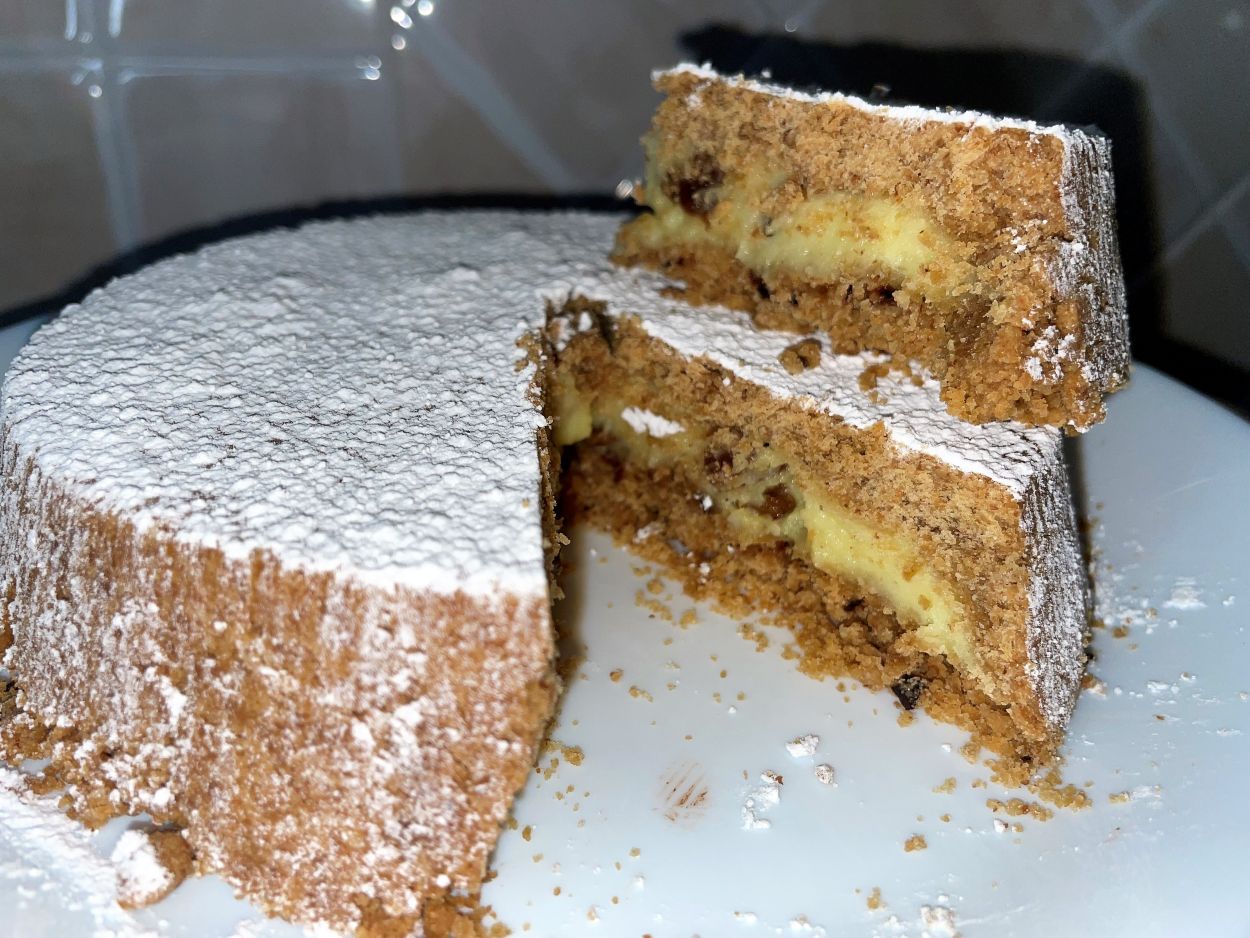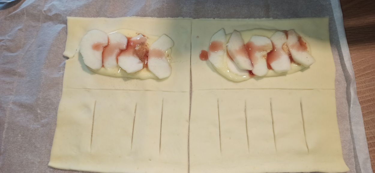 sull’altra metà mettete un poco di crema pasticcera, adagiate sopra le fettine di mela, profumate con la cannella, e completate con il succo delle amarene sciroppate