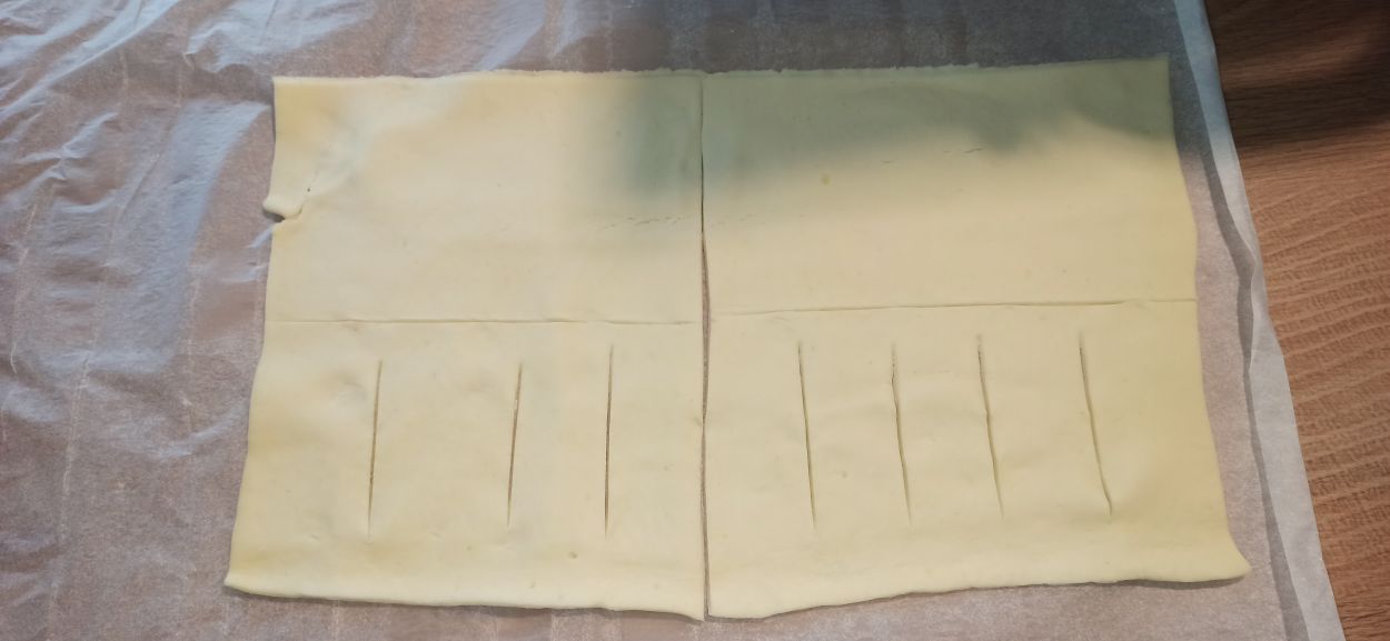 Per preparare i fagottini di pasta sfoglia alle mele, iniziate a preparare la crema pasticcera, seguendo la ricetta Sbucciate la mela, e ricavate delle fettine sottili. Srotolate la pasta sfoglia, sul piano da lavoro, dividetela in quattro quadrati. Su la metà di ogni quadrato, praticate tre incisioni,