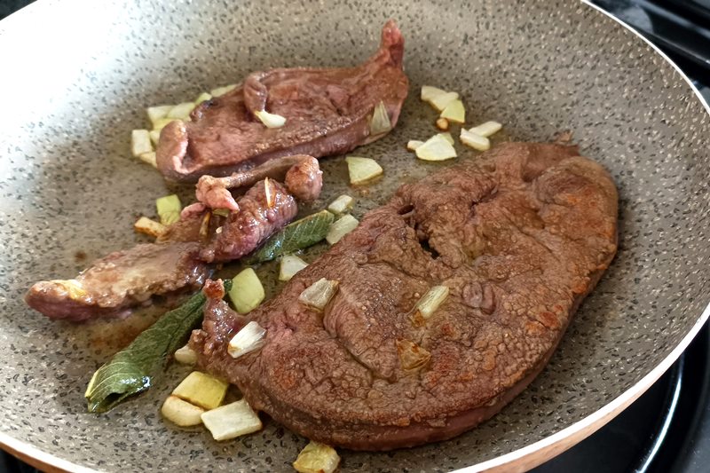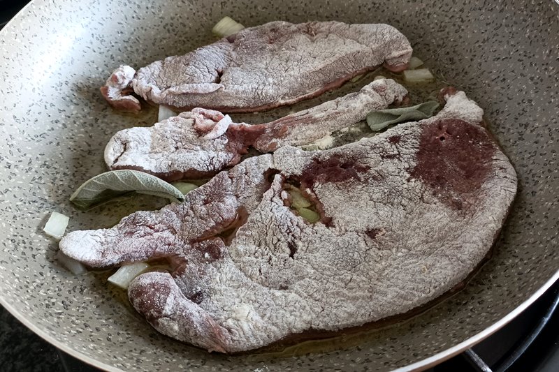 In una padella fate soffriggere qualche cucchiaio di olio con la cipolla tritata e le foglie di salvia. Eliminate eventuali nervi del fegato, per evitare che si arricci in cottura, ed infarinate le fette da entrambe le parti; posatele nella padella a fiamma media, facendole dorare per 3/4 minuti su ciascun lato.