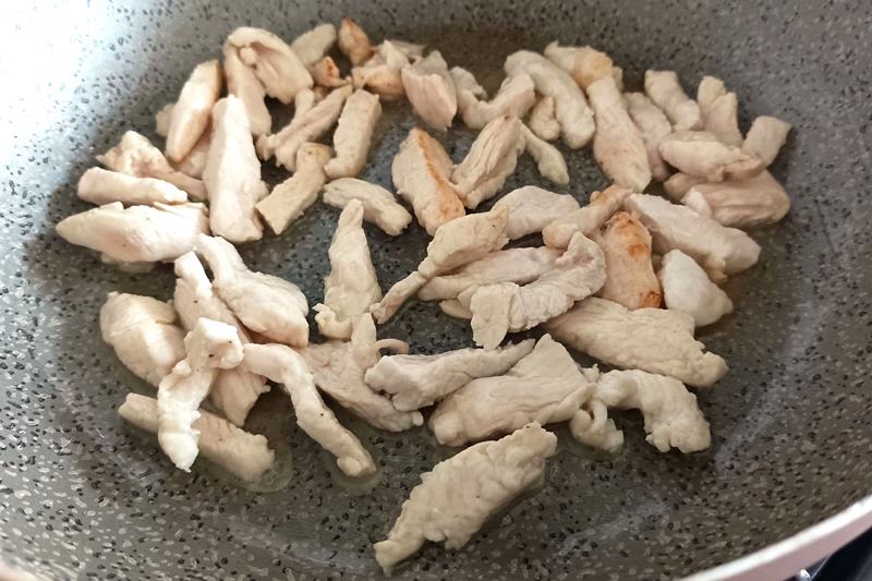 Tagliate il pollo a straccetti, fateli rosolare in una padella capiente, con metà burro, sale e pepe, e cuocetelo bene;