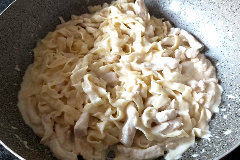 Le fettuccine Alfredo con pollo sono pronte da gustare, calde e cremose.