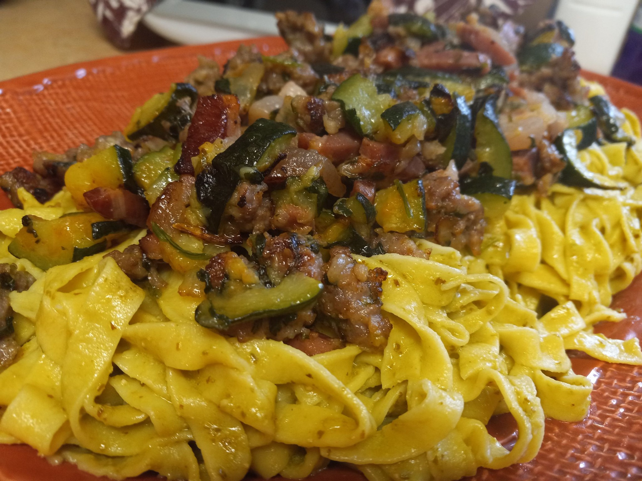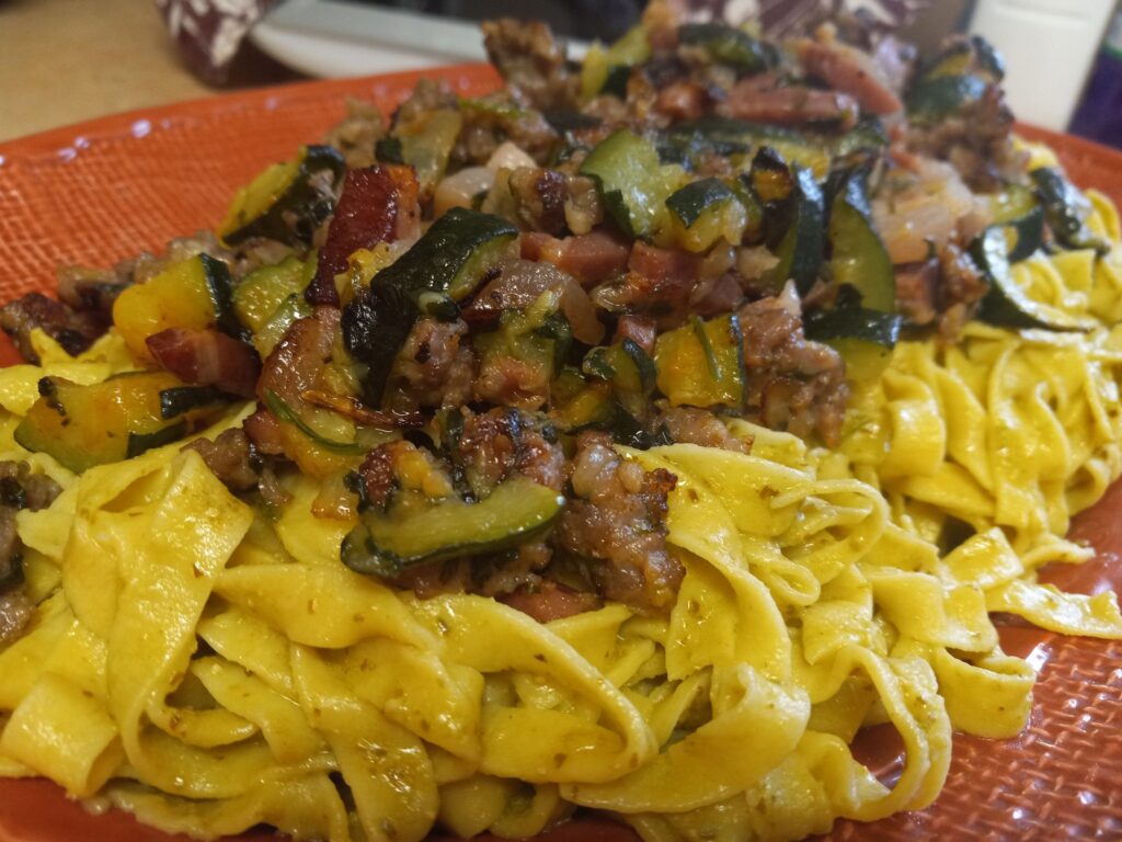 Cucinare la pasta all’uovo in casa è un gesto d’amore che racconta la nostra tradizione. La farina tra le dita, il tuorlo che colora l’impasto, il profumo del ragù che cuoce piano sul fuoco… tutto ci riporta a quelle domeniche lente, in cui si condivideva il tempo prima ancora del cibo. Il ragù di zucchine e salsiccia è un’alternativa rustica e saporita al classico sugo rosso, più delicato ma ugualmente avvolgente. Il risultato? Un piatto equilibrato, profumato e confortante, dove ogni forchettata sa di casa.