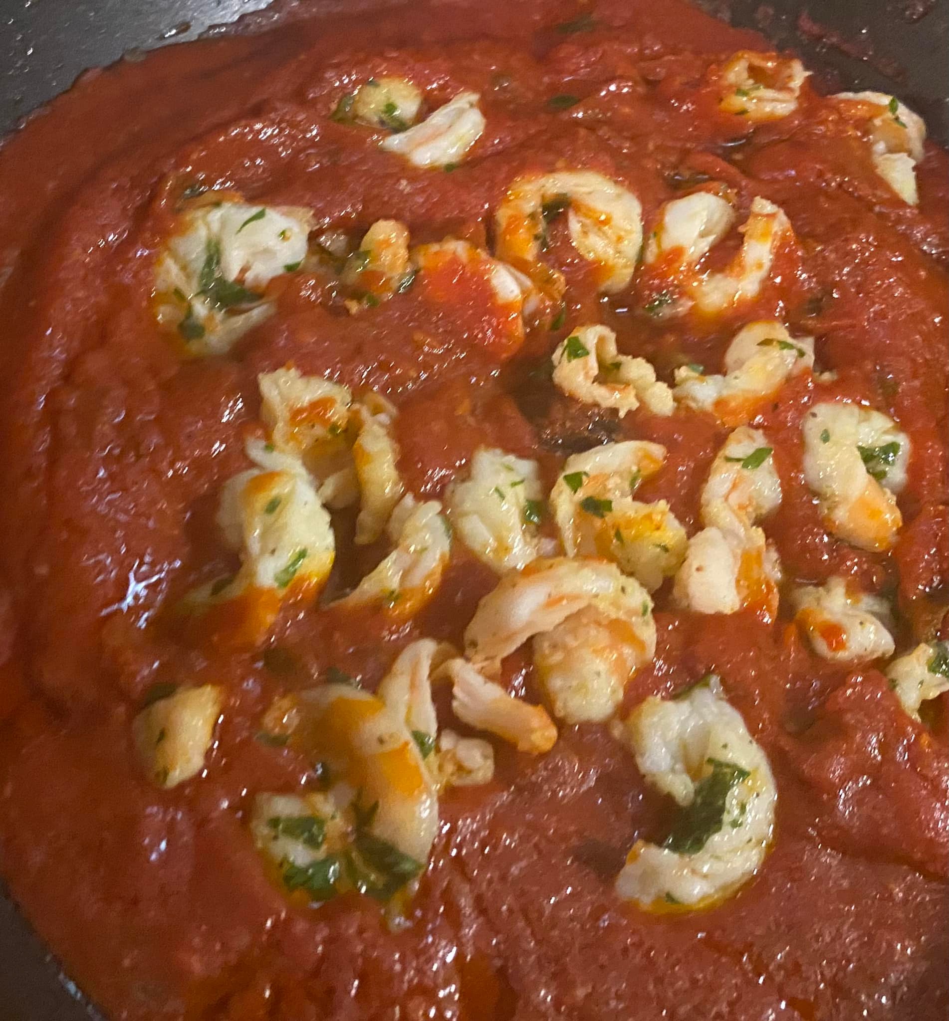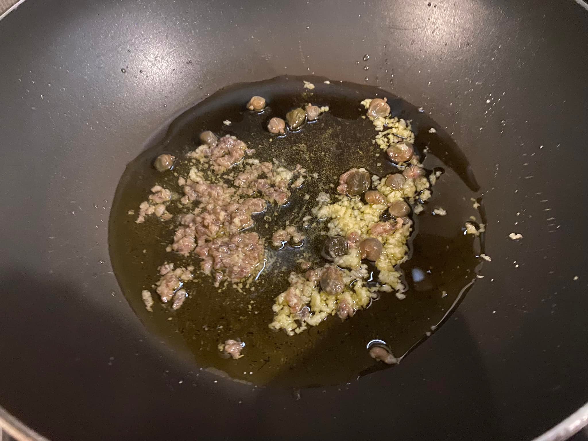 Tagliamo a met i gamberi, tritiamo con un coltello le acciughine. Tagliamo molto finemente l’aglio, Tagliamo a metà le olive e dissaliamo i capperi. Riscaldiamo una padella, versiamo due cucchiai di olio evo, quando ben caldo inseriamo prima le acciughie e a fuoco medio lasciamo che si sciolgano. Poi aggiungiamo in padella l’aglio e i capperi e un pizzico di peperoncino in polvere. Rosoliamo qualche minuto ed aggiungiamo le olive. Lasciamo insaporire il tutto, mescoliamo e poi versiamo i pomodori pelati, spolveriamo con del prezzemolo e cuociamo a fuoco medio basso per 10 minuti circa.