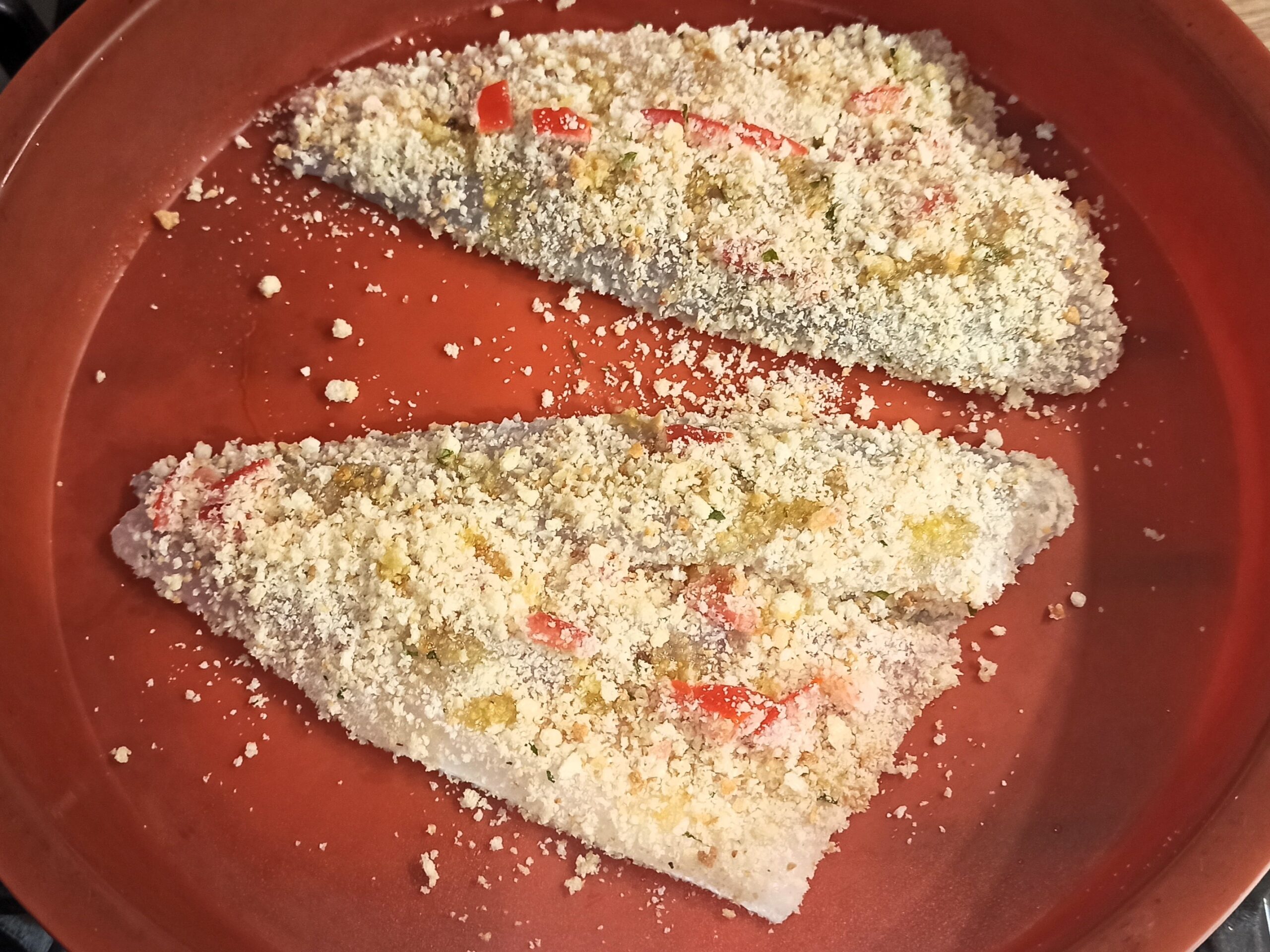 Per preparare i filetti di orata gratinati in friggitrice ad aria, iniziate a lavare ed asciugare i filetti di orata. Con l’aiuto di un pennellino, ungete i filetti da ambo le parti. In un piatto mettete il pane grattugiato, il sale, il prezzemolo tritato ed il pomodorino tagliato a pezzetti piccoli, io ho eliminato i semi.
