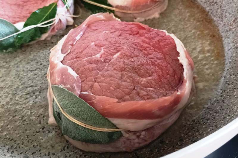 Avvolgete il bordo dei filetti con una fetta di speck, pancetta, o prosciutto crudo, a piacere inserite inserite erbe aromatiche, e racchiudeteli con uno spago, per evitare che perdano la forma in cottura.