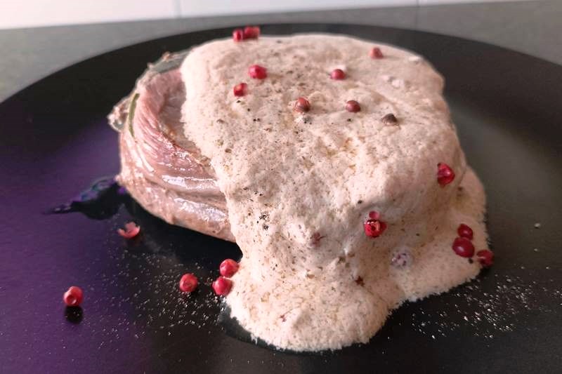 La particolarità di questo piatto è la salsina di accompagnamento, realizzata con il fondo di cottura della carne, a cui viene aggiunta la panna ed il pepe rosa, una spezia leggermente piccante e molto profumata.