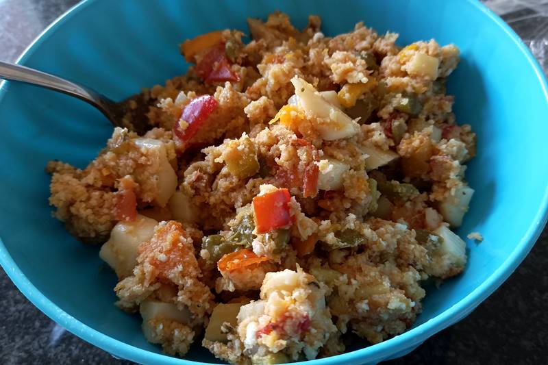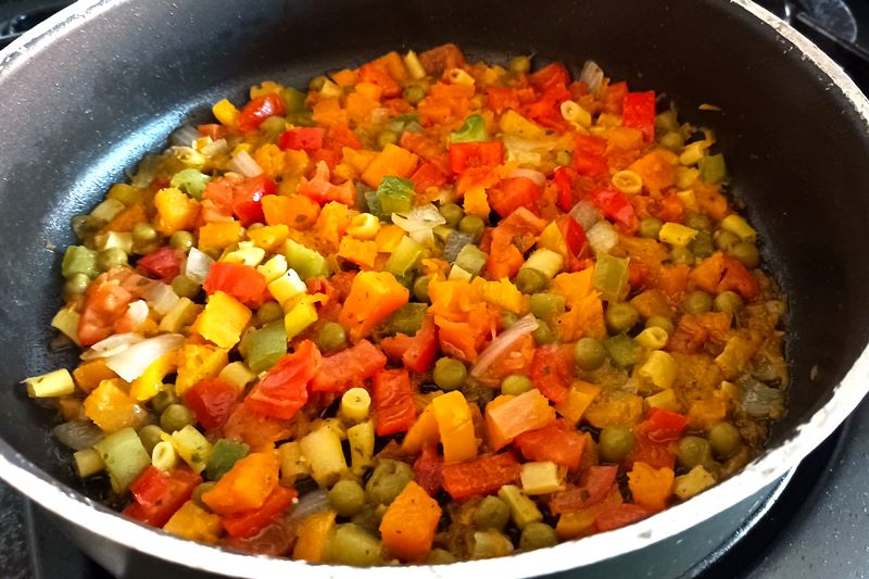 Pulite, lavate le verdure, tagliatele a piccoli cubetti e mettetele n una padella con un filo d’olio; fate rosolare le verdure 5 minuti, aggiungete sale e pepe, quindi mettete il coperchio e lasciate cuocere a fuoco basso 20 minuti, aggiungendo se occorre qualche cucchiaio di acqua, fino a che saranno morbide ed abbastanza asciutte;