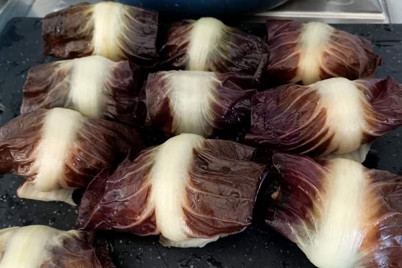 Nel frattempo sfogliate il radicchio per ricavare le 10 foglie, lavatele sotto abbondate acqua corrente, e “scottatele” due minuti in un tegame teglia con acqua salata bollente: scolatele e fatele raffreddare su di un vassoio.