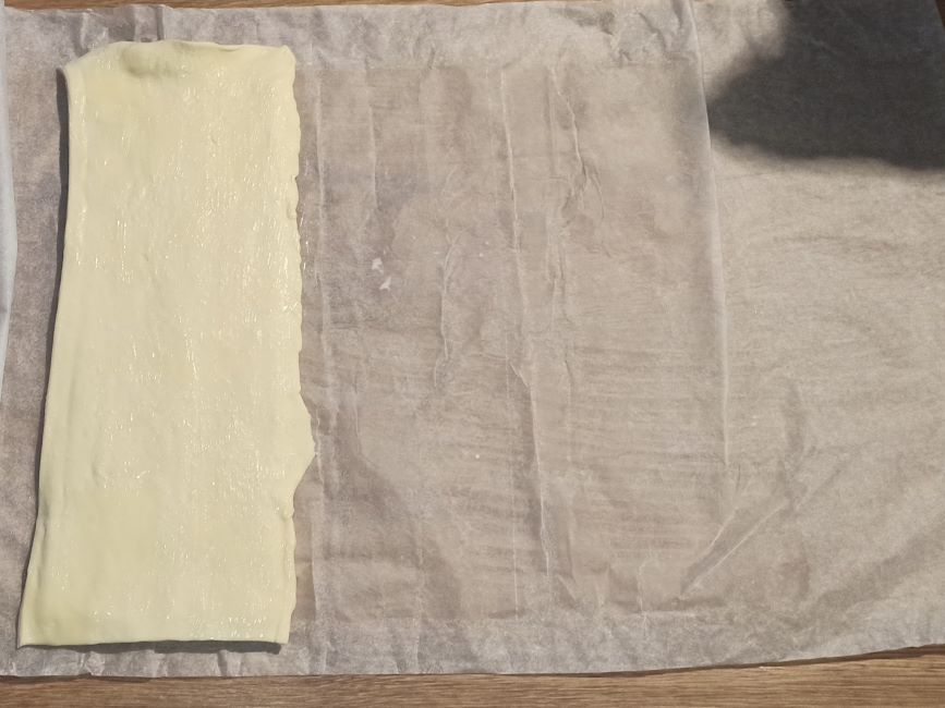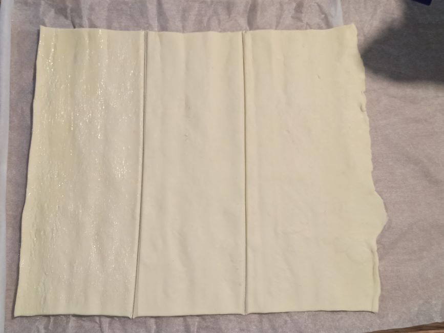 Per preparare le francesine rustiche, srotolate la pasta sfoglia, mantenendola sempre sul foglio in cui è avvolta. Dividetela in tre parti,