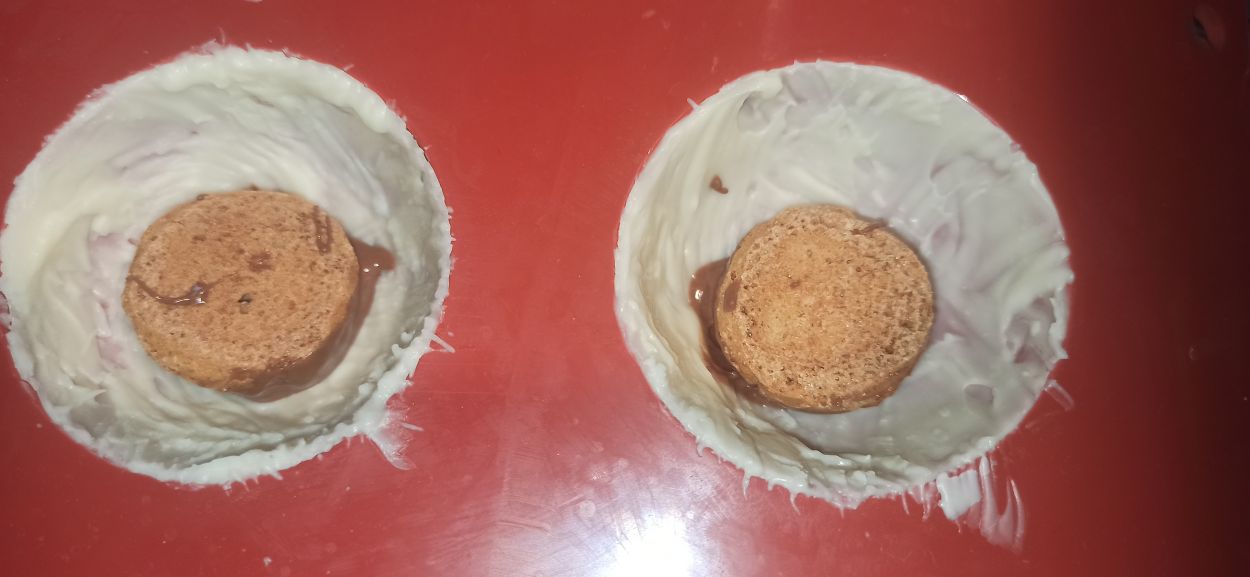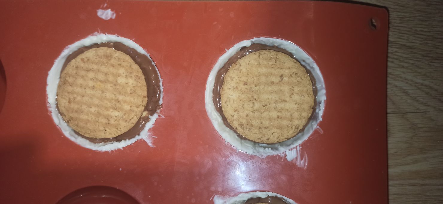 Riempite con il composto i singoli stampini, lasciando mezzo centimetro libero, in modo da poter posizionare il biscotto rotondo,
