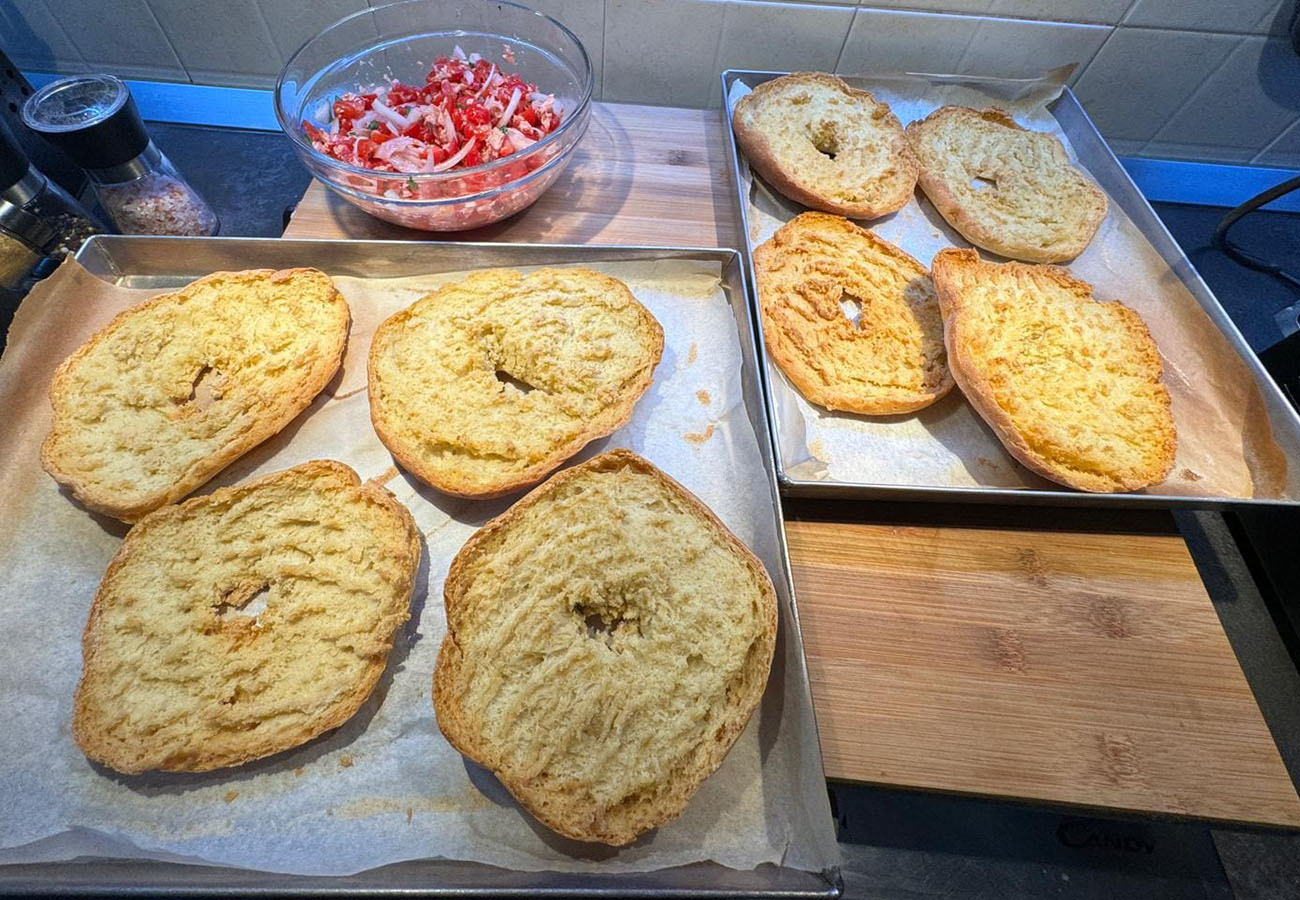 Spolverate la superficie con un po’ di farina ’00’, formate un’altra palla, copritela con la pellicola e lasciatela lievitare per circa 3 ore. Dopo il tempo di lievitazione, dividete l’impasto in circa 5 panetti. Con il dito, create un foro al centro di ciascun panetto, modellandoli a forma di tarallo. Adagiate le friselle su una teglia rivestita di carta da forno e lasciate lievitare nuovamente per un’ora. Prima di infornare, allargate leggermente i fori centrali. Cuocete in forno preriscaldato statico a 200°C per 10-15 minuti, finché non saranno gonfie. Sfornate e tagliate a metà ogni frisella, quindi rimettetele sulla teglia e cuocetele nuovamente a 170°C per circa 30 minuti, fino a raggiungere la consistenza desiderata. Le vostre friselle sono pronte per essere gustate.