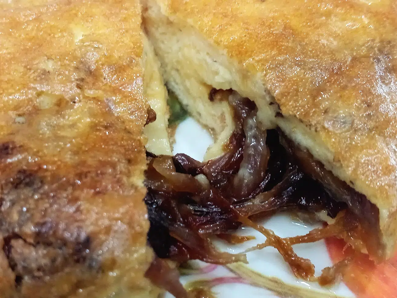 Adesso passiamo alle uova. Sbattiamole bene, saliamole. Adesso prendiamo la metà delle uova ( nella ciotola) e inseriamole nella padella ( calda, non rovente, con un filo d’olio). Facciamola cuocere qualche minuto e poi versiamo le cipolle e copriamo con qualche fetta di formaggio ( provola fresca, fior di latte, galbanino). Facciamo cuocere un altro minuti e ultimiamo con l’altra parte di uova.